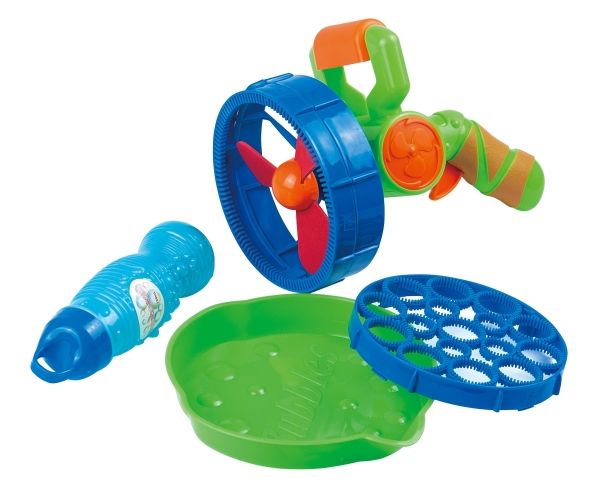 Megastora eller små bubblor? Den här såpbubbelpistolen kommer med två ringar, som du enkelt kan växla mellan och variera dina såpbubblor. Det gör allt lite mera festligt. Det ingår också ett kar samt flaska med 118 ml såpbubbelvätska. Från 3 år.
