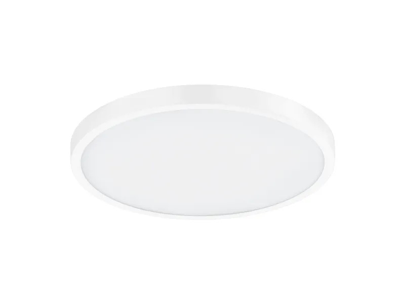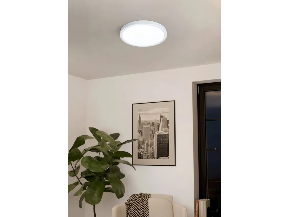 This surface-mounted luminaire of the SALOBRENA-C series is made of aluminium and a luminous surface of white plastic. It is available in three different sizes; an EGLO connect remote control is included.