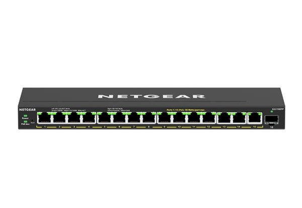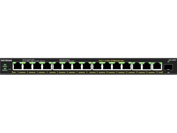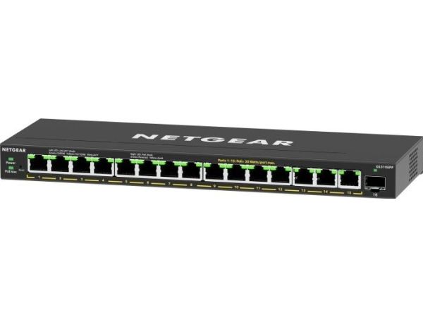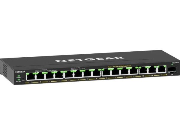 The NETGEAR 16-Port High-Power PoE+ Gigabit Ethernet Plus Switch delivers essential business networking features and powers PoE+ devices like VoIP phones, IP cameras, and more.