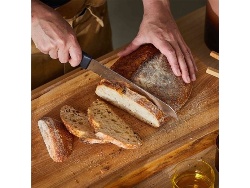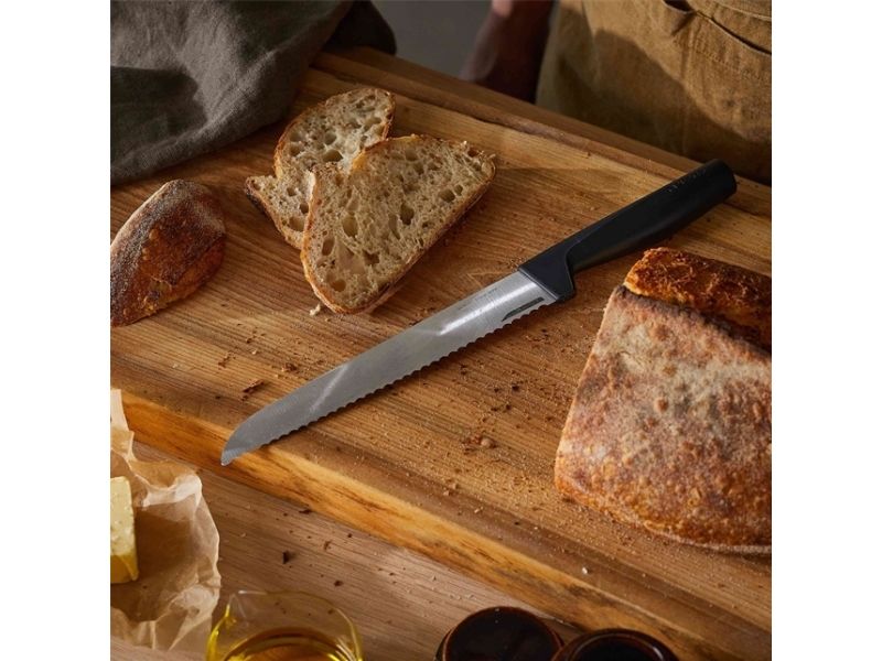 Discover the Fiskars Hard Edge bread knife, a culinary essential that combines modern technology with traditional craftsmanship. This 21.8 cm knife features a stainless-steel blade enhanced with LZR-EDGE technology for sharpness and precision in every slice. The integrated finger guard ensures your safety, allowing you to focus on creating culinary masterpieces. Designed for both durability and ease of maintenance, its dishwasher-safe quality makes cleanup a breeze. Whether you're a professional chef or a home cook, this knife is the perfect tool for effortlessly slicing through bread and other baked goods.