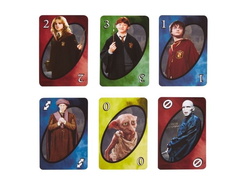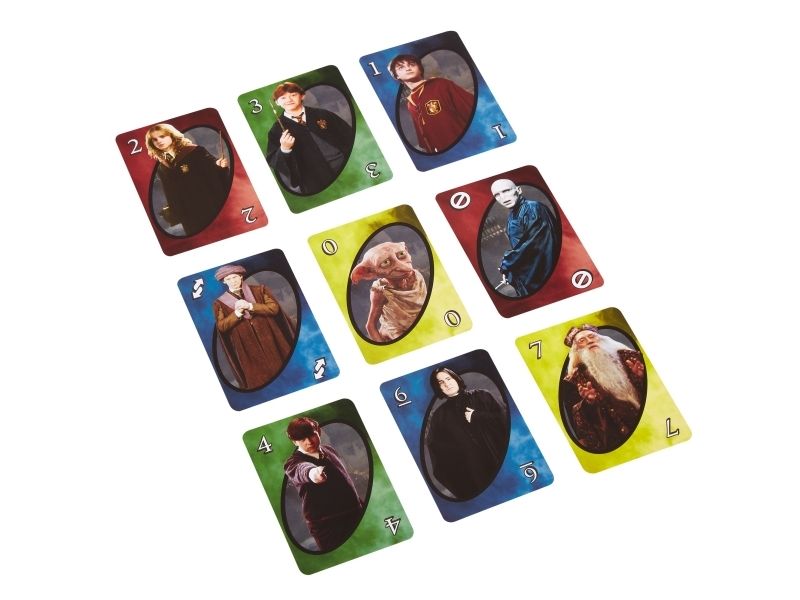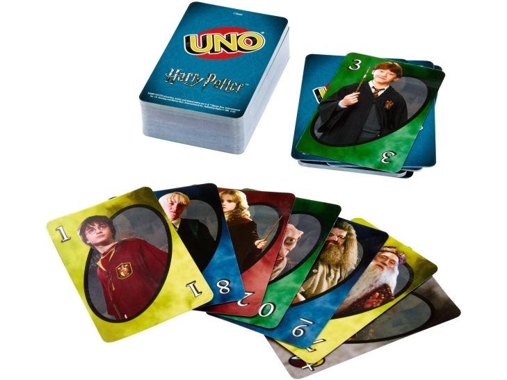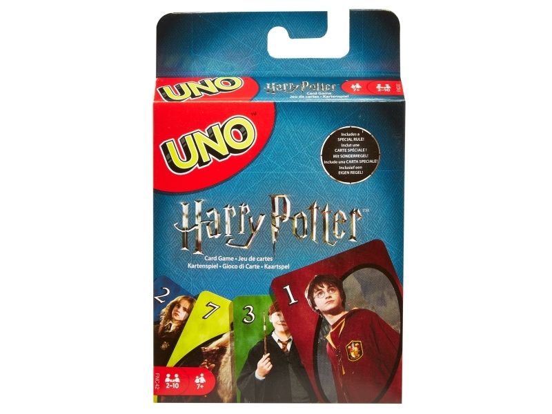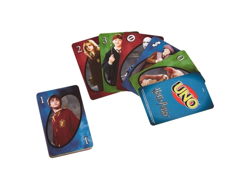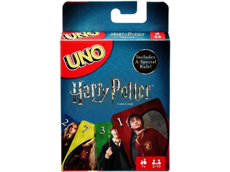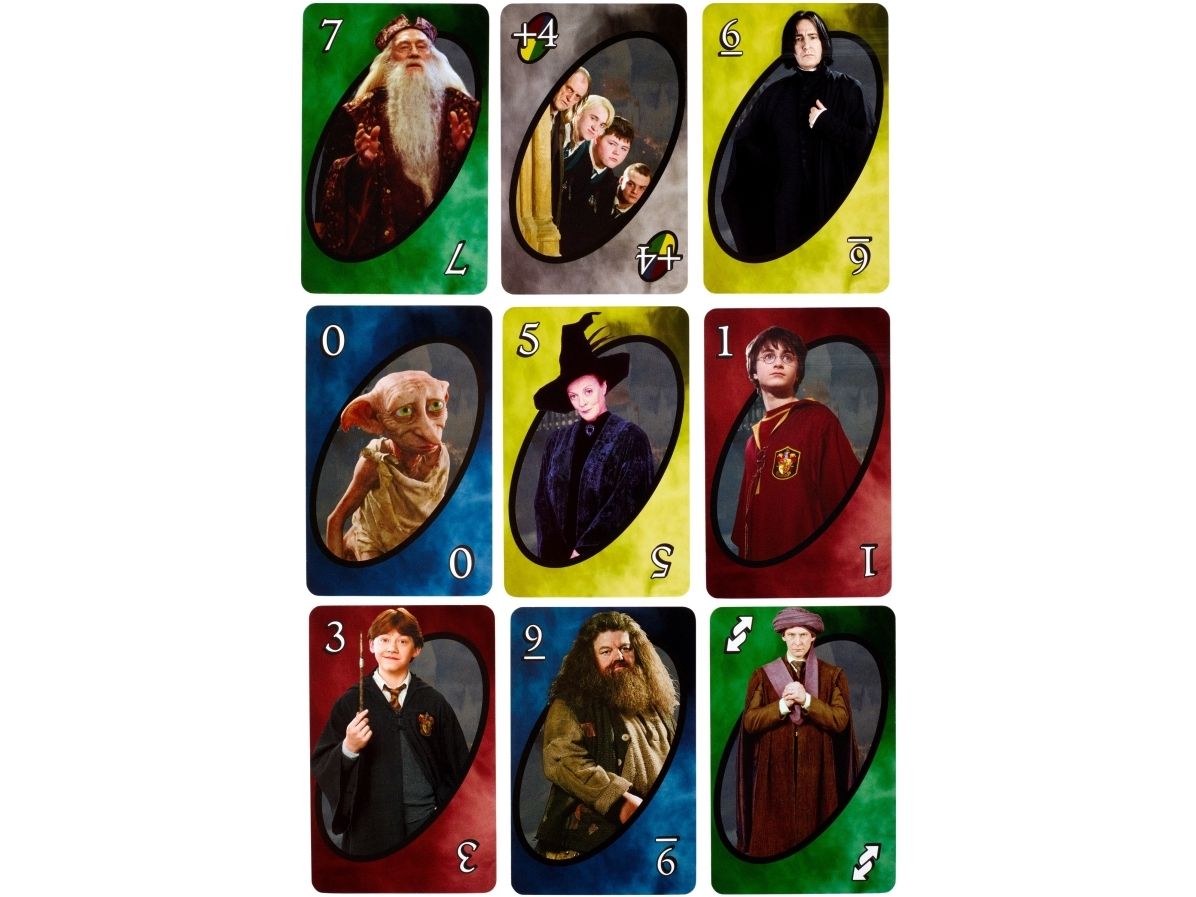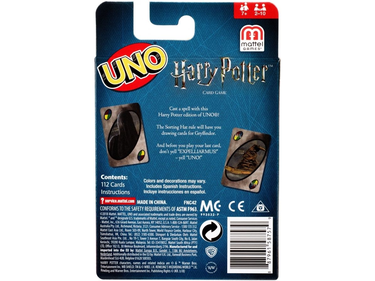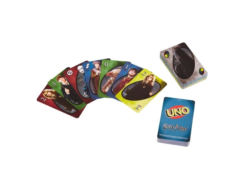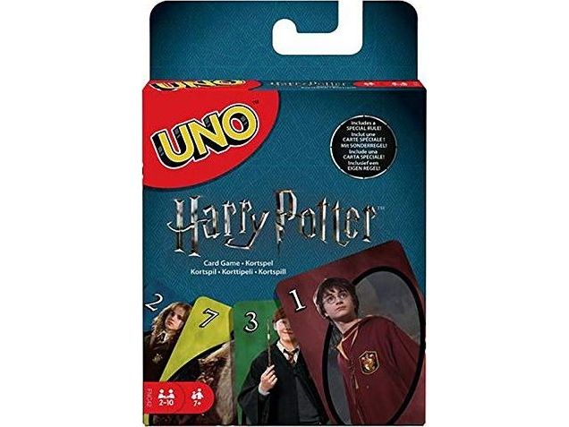 Det roliga och fartfyllda kortspelet du älskar har nu legendariska figurer från Harry Potters värld! Spela med Harry, Hermione, Ron, Professor Dumbledore och flera av dina favoritfigurer från Hogwarts under en spelkväll med UNO™. Spelarna tävlar om att bli av med alla sina kort genom att matcha ett kort på handen med kortet som ligger överst i högen. Få poäng genom att bli den första som blir av med korten på handen. Med de speciella händelsekorten blir det spännande och oväntade spelomgångar eftersom du kan använda dem för att besegra dina motståndare på olika sätt. Det finns till och med ett speciellt Sorting Hat-regelkort! När du spelar ut det kortet måste en annan spelare dra kort tills de får ett Gryffindor-kort! Exempel på andra händelsekort är hoppa över-kort, vändkort, dra två-kort och jokerkort. Den spelare eller det lag som först får 500 poäng vinner – och glöm inte att skriva ”UNO!” när du bara har ett kort kvar. En fantastisk present till Harry Potter-fans, från 7 år och uppåt. Innehåller 112 kort plus spelregler. För 2 till 10 spelare i åldern 7 år och uppåt. Färger och dekorationer kan variera.Nu kan du spela UNO™ tillsammans med dina favoritfigurer från Harry Potter! Samma spelupplägg som Basic UNO™, men med bilder på Hermione, Harry, Ron och andra figurer från Harry Potters magiska värld! Målet är att bli av med alla kort i handen. Den första spelaren eller laget som får 500 poäng vinner. Det finns flera speciella händelsekort, som hoppa över-kort, vändkort, dra två-kort och jokerkort.Sorting Hat-kortet gör att en annan valfri spelare måste fortsätta dra kort tills hen får ett Gryffindor-kort!En underbar present till Harry Potter-fans, från 7 år och uppåt. Innehåller 112 kort plus spelregler. Färger och dekorationer kan variera.