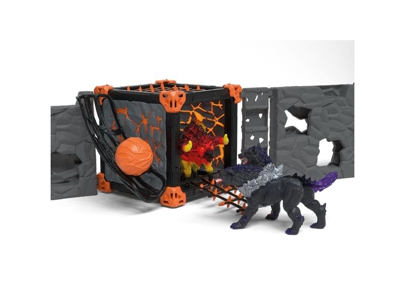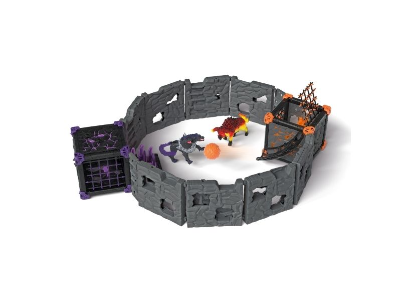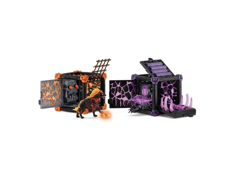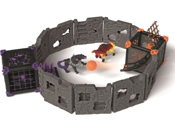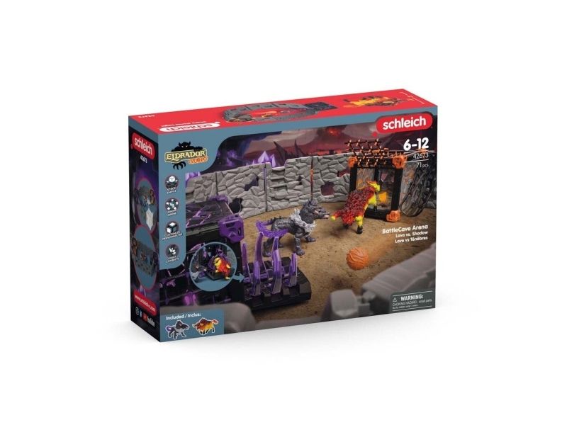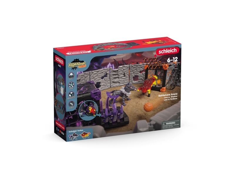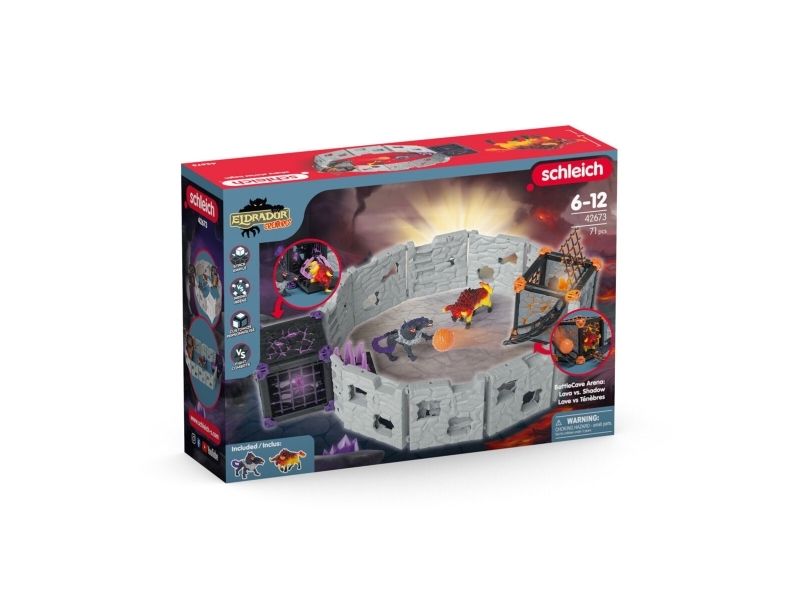Det hettar till på arenan! BattleCaves ställs mot varandra och inväntar sin tur. Det är här som varelserna i ELDRADOR® försvarar sina dyrbara världskristaller. Den farliga Eldstjuren är redo för attack. Han gapar och visar sina huggtänder. Sedan skakar han sitt mäktiga huvud. Kommer Skugghunden att ge sig in striden och ta sig in i Lava BattleCave? ELDRADOR® CREATURES BattleCaves förvandlar varje barnrum till en actionzon! Vem ger sig in i den hisnande striden? Alla BattleCaves kan kombineras. Skrämmande tunnlar och kluriga fällor väntar på angriparna. På den stora arenan kan de sedan mötas för den slutliga duellen. Vilken kamp!