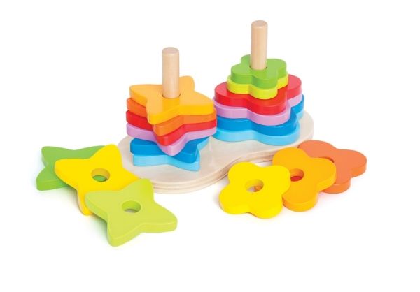 En färgggrann stapel med blom- och stjärnformer. Innehåller nio färger och två olika former så att barn kan skapa spiraler och en ny kombination vid varje lek tillfälle. Introducerar logik och utvecklar skicklighet. Lämplig från 12 månader.