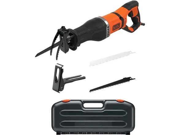 The BLACK+DECKER 750W corded reciprocating saw has the power and versatility to suit any task. The Removable Branch Holder allows for efficient and steady cutting of multiple sized branches and the Adjustable Shoe enables the shoe to be moved in or out to suit the task at hand.Tool-Free Blade Change allows for a quick and hassle-free blade swaps between applications. This saw comes with 2 blades and branch holder.Black & Decker BES301. Product colour: Black, Orange. Idle stroke rate (max): 2800 spm, Stroke length: 2 cm. Power source: Battery, Input power: 750 W