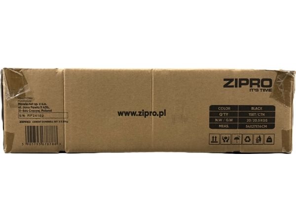 Zipro-hantlar består av två korta stångar på 52 cm och vikter med en total vikt på 40 kg. Viktskivorna är gjorda av cement belagda med ett plastlager, vilket skyddar underlaget vid nedsläpp och vid avstängning efter avslutad serie.