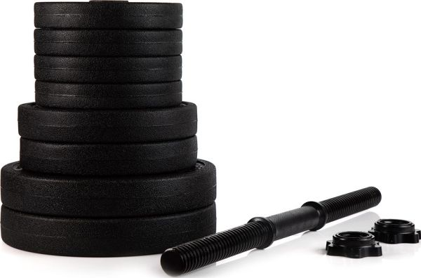 Information - Fyllning av vikter: cement - Viktöverdrag av plast - Stånglängd: 52 cm - Räfflade gripdelar på stångarna - Viktdiameter: 30 mm - Setet innehåller: - 2 x stålstång 52 cm - 8 x vikt 1,25 kg - 4 x vikt 2,5 kg - 4 x vikt 5 kg - 4 gängade klämmor - Transportmått: 2x (54 x 27 x 16 cm / 20,5 kg)