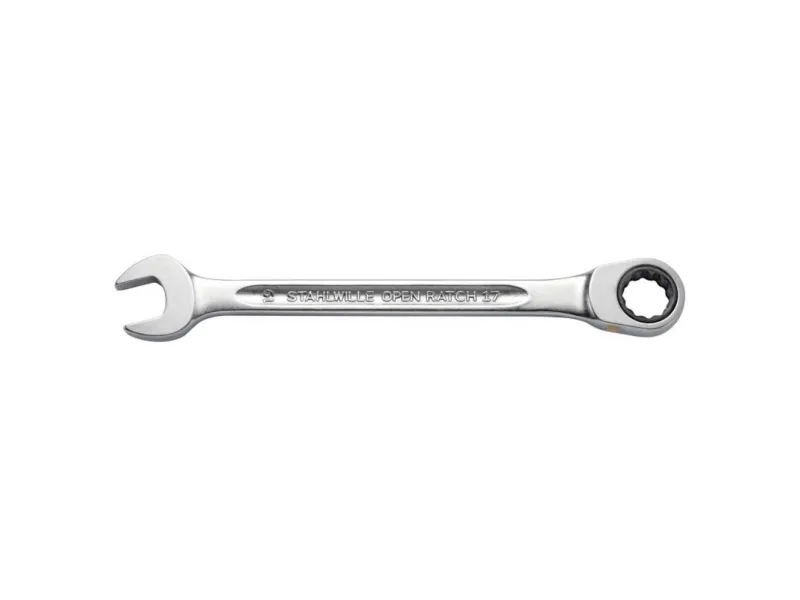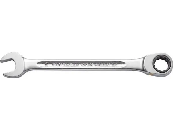 · skralde-ringgaffelnøgle med metriske, samme nøglebredde · ringside flad udførelse med dobbelt sekskant · 72 tænder, arbejdsvinkel 5° · gaffelposition 15° · højre-/venstre-træk ved at vende nøglen · stabil, slank og let intelligent konstruktion · høj bøjestyrke med dobbelt-T-profil · gribesikker, hudvenlig overflade med Stahlwille rundfinish · ekstremt belastbar, usædvanligt lang levetid · sænksmedet, hærdet og nedkølet i oliebad · Chrome-Alloy-Steel, forkromet