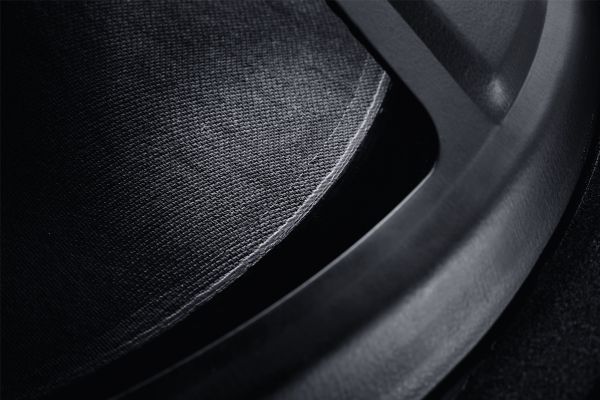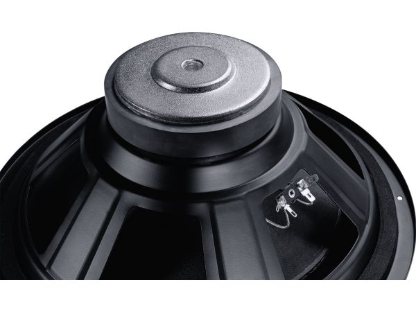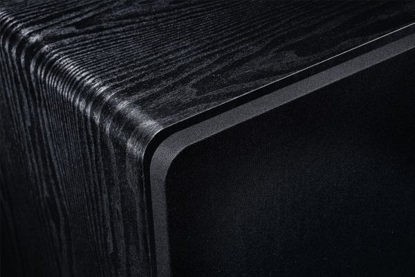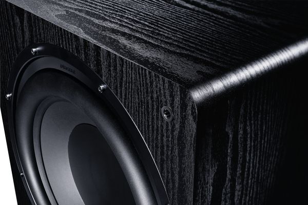 The solid MDF housing is optionally available in a black ash or mocha finish. The RS12 measures 360 mm wide and stands 465 mm tall. The standard fabric grille can be easily removed to reveal the impressive bass chassis.