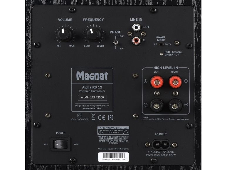 The Magnat Alpha RS 12 features a 300 mm (12 inch) high-power long-throw woofer in a bass reflex housing that is equipped with two Airflex ports. The integrated Class D amplifier delivers 120 watts of continuous power, while the peak power is an impressive 240 watts. The technology incorporated in the RS12 allows it to reproduce frequencies down to 20 Hz. The amplifier electronics allow the volume, crossover frequency and phase to be regulated, thereby enabling optimal adaptation to the acoustics of the room.
