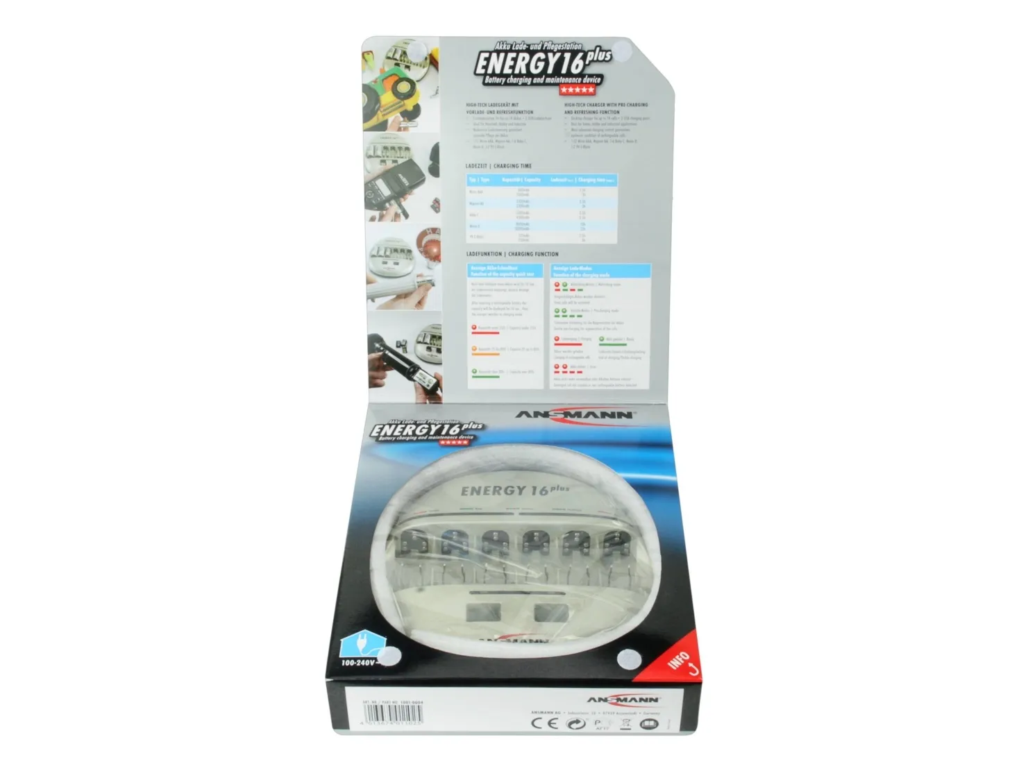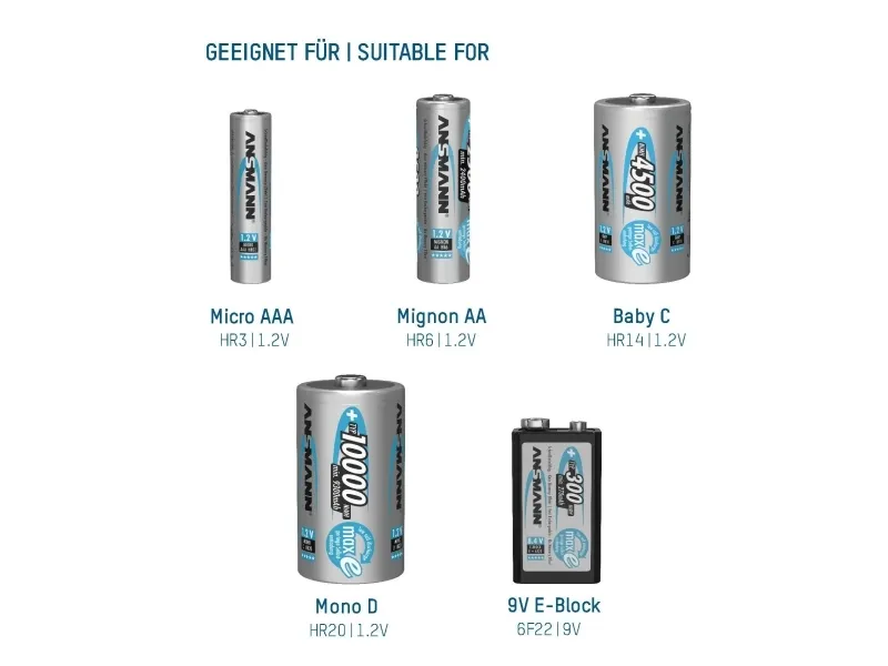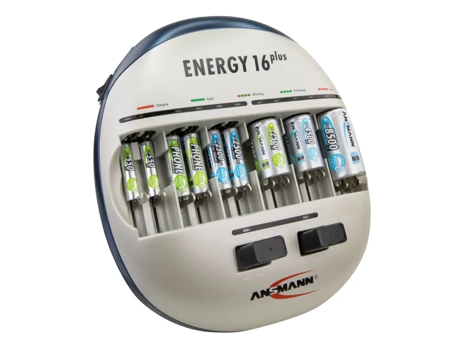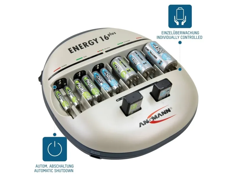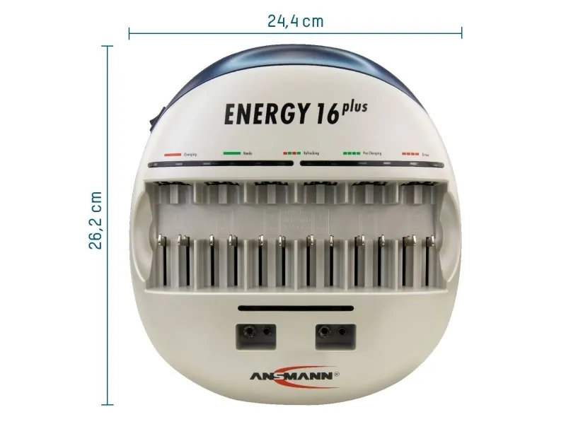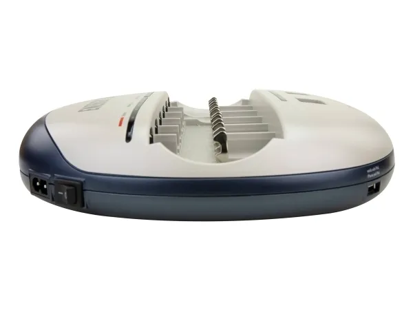 - Suitable for NiMH/NiCd rechargeable batteries - Capacity quick test of the inserted cells for approx. 10 seconds: - LED green: capacity over 80% of the nominal capacity - LED orange: capacity between 25-80% of the nominal capacity - LED red: capacity under 25% of the nominal capacity - Auto-diagnosis of the inserted cells with automatic start of a pre- charging and/or refreshing process, if required, tired cells will be activated - Fast charging - Microprocessor controlled charging - Battery-full detection (-dV) - Automatic switch to trickle charge - Multiple over charging protection - Individual supervision of each cell position - Faulty cell & alkaline battery detection - Easiest handling due to fully automatic control - Clear indicators and controls for each charging position - Reverse polarity protection - For worldwide use - 3 years warranty