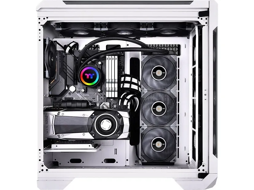 TOUGHLIQUID 360 ARGB Sync is an all-in-one liquid cooler that supports 5V RGB-compatible motherboards, allowing users to control lighting effects with their motherboard's software.