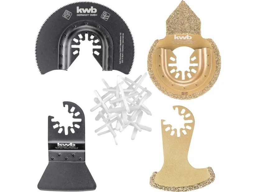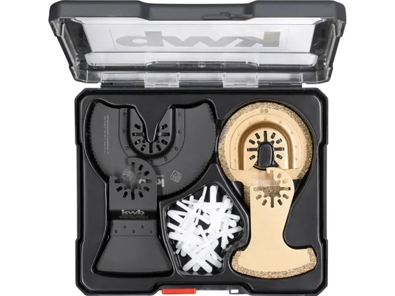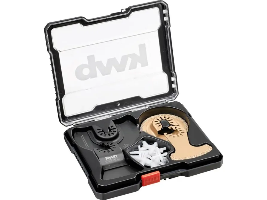 Gamla kakelplattor och fogmassa kan bytas ut på nolltid med det 22-delade multiverktygssetetet för badrum från kwb. Tack vare kombinationen av fyra insatser för alla kommersiellt tillgängliga multiverktyg och 18 kakelskärare i tre olika storlekar kan gör-det-självare och proffs ha alla verktyg de behöver precis vid sina fingertoppar. De hårdmetallbelagda insatserna motstår även resistenta material och behåller sin form permanent. Detta gör det helt enkelt att ta bort kakel och fogmassa. De nya kakelplattorna kan läggas med noggrann precision med hjälp av setets kakelskärare. Detta badrumsset innehåller en praktisk låda för att förvara delarna.