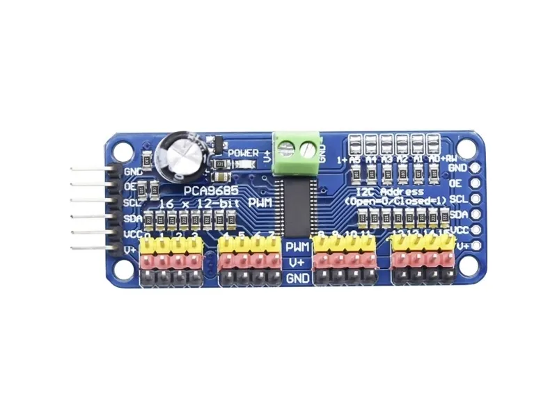 6 adressestifter, med hvilke du kan lægge kabler til op til 62 af dem på en enkelt i2c-bus, i alt 992 udgange - det er mange servoer eller LED'er er une en indstillelig frekvens PWM op til ca. 1,6 kHz. Derudover er der en 12-bit-opløsning til hver udgang - for servoer betyder det en opløsning på ca. 4 us ved en opdateringshastighed på 60 Hz. Konfigurerbar push-Pull- eller open-drain-udgang og udgangsfrigivelsespin til hurtig deaktivering af alle Udgange