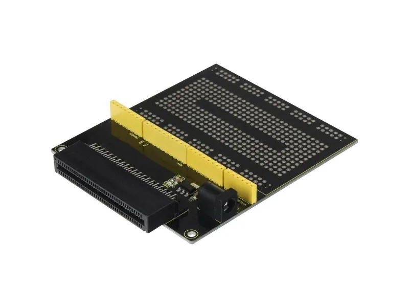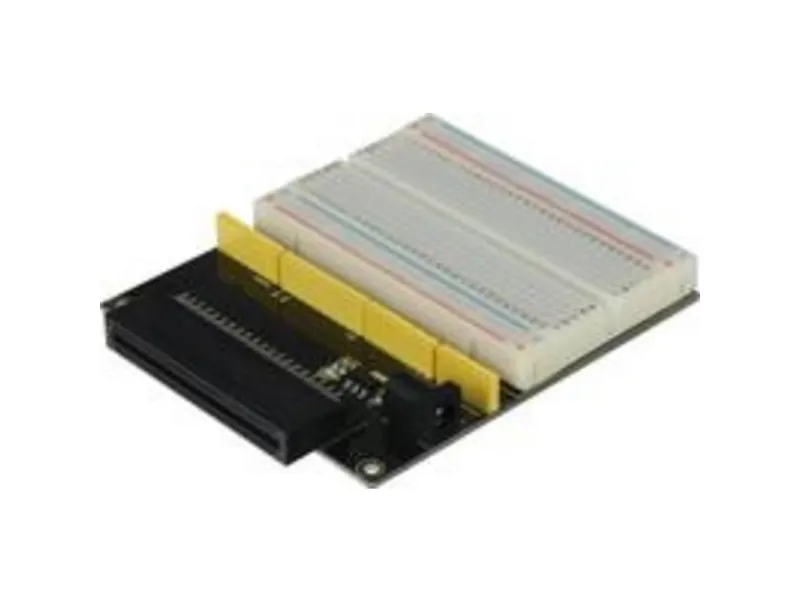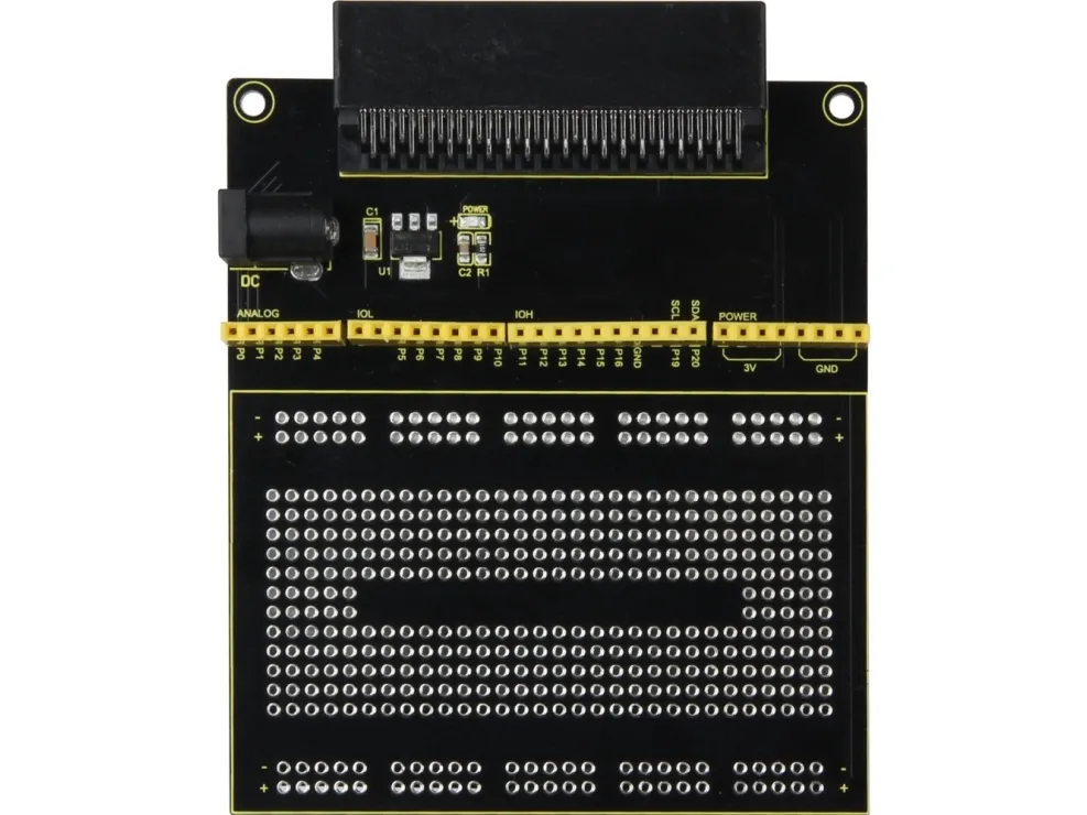 Prototyp breakout-Board V2 med brödbrädaDetta breakout-kort gör alla kontakter på Micro:bit lätt tillgängliga som stiftanslutningar. Dessutom är det utrustat med en reglerad spänningsförsörjning, vilket gör det möjligt att använda breakout-kortet med 5 9V. Med hjälp av den medföljande brödbrädan är detta breakout-kort särskilt lämpligt för Micro:bit för test- eller experimentella anslutningar. På den fritt vätbara brödbrädan i den nedre halvan av brädan kan komponenter eller hela projekt också lödas ihop för en mer långvarig tillämpning.