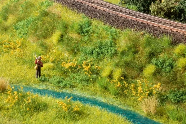 What’s so special about the Groundcover Foliage? Various grasses and pieces of flock material are electrostatically flocked onto a non-adhesive backing sheet. Due to the special, permanently flexible adhesive, the foliage can be effortlessly pulled off the backing sheet. The Groundcover Foliage is then incorporated into the model landscape as a whole or in pieces. We recommend the Landscaping Glue for glueing.