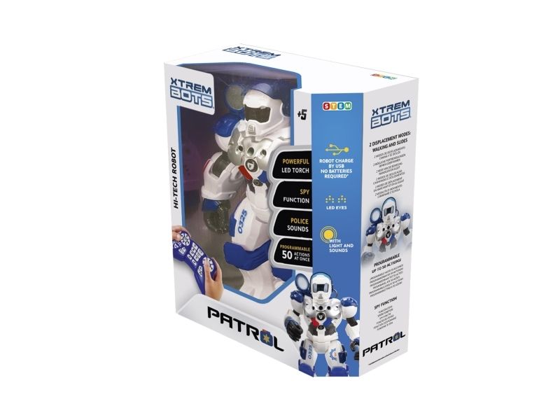 Sätt din patrullrobot på jobb! Precis som en spion spelar polisroboten in och upprepar allt det som blir sagt. Tänd ljuset och polisljusen och låt aldrig en bov komma undan. Och använd dig av alla sirener och skjutljud, så gör du leken ännu mera realistisk. Ladda upp via USB. Från 5 år.