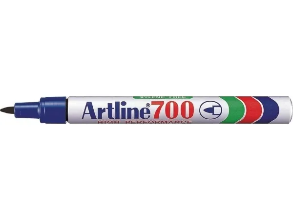 Marker, Artline 700. Idealisk för att skriva på glas, trä och metall. Kan användas på kontoret, inom industrin, i skolan eller hemma. Marker har lock med clips och är xylenfri. Bläcket är vattenavvisande och snabbtorkande. Rund spets med 0,7 mm linjebredd. Beställningsenhet: st. Förpackning: 1/12