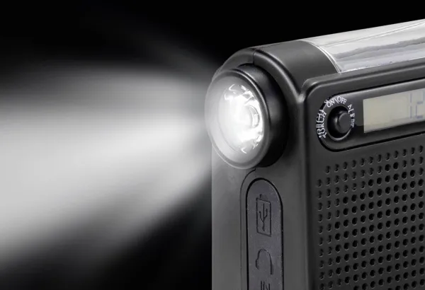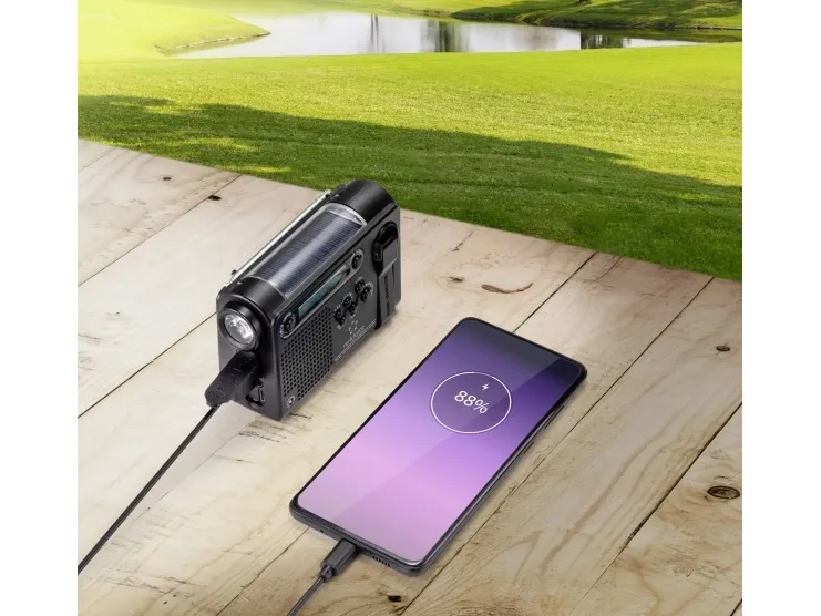 Flere nødfunktioner som for eksempel opladning ved hjælp af solenergi, opladning med håndsving, opladning via mobiltelefon, opladning via lommelygte og alarm