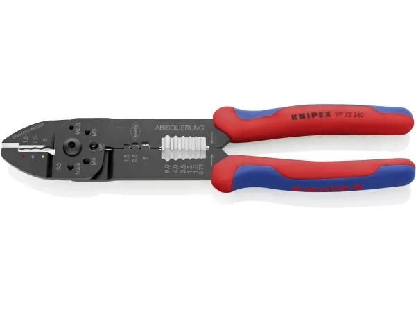 För kapning av kablar, strippning av ledningar och pressning av isolerade och oisolerade kabelskor och kontakter samt öppna kontakter. Med gängade hål för kapning av Cu- eller Ms-gängade tappar M 2,6; M 3; M 3; M 3,5; M 4 och M 5. Skruvförband för hög stabilitet och jämn gång. SB-backing/blisterförpackning