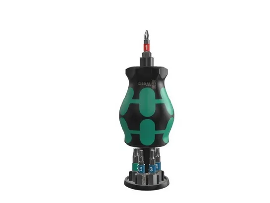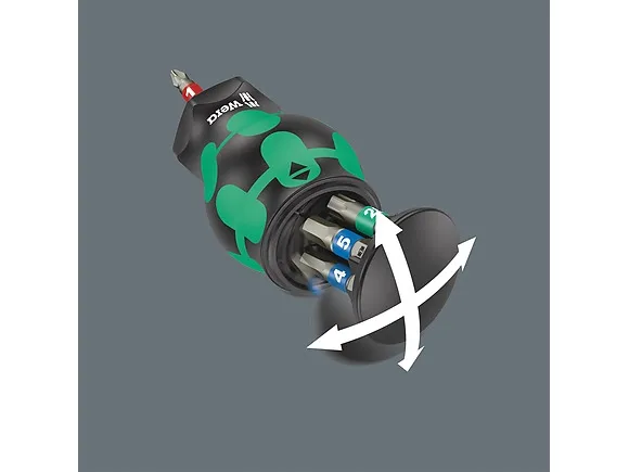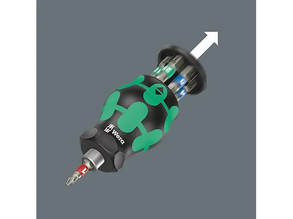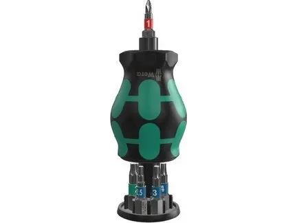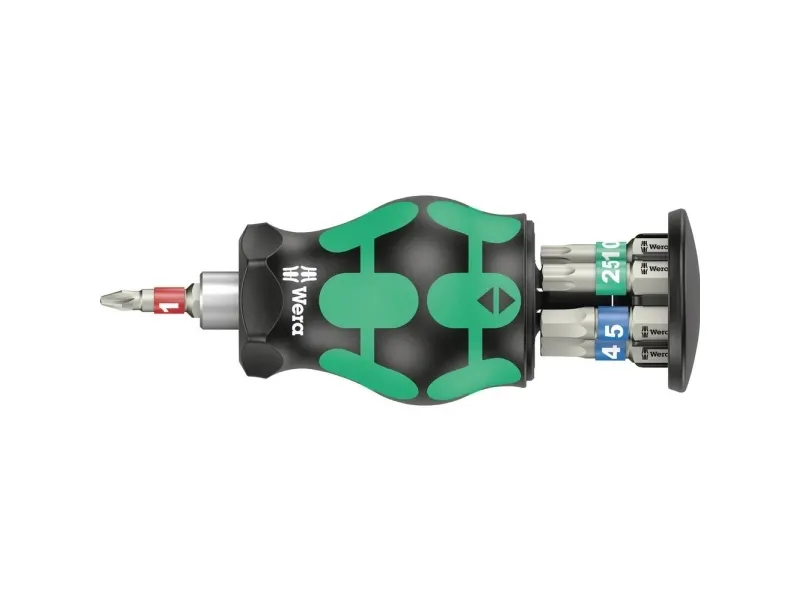 för snabb användning på cykeln. Särskilt litet bitshandtag med kort bitshållare för svåråtkomliga områden. Innehåller 7 bits i rostfritt stål, 6 i ett magasin i handtaget och 1 i bitshållaren. 2-komponents Kraftform-handtaget med sin praktiska kombination av hårda och mjuka zoner gör det möjligt för dig att packa fast och precist arbete. Take it easy verktygssökare: med drivfärgsmärkning och storleksstämpel, så att du enkelt hittar den bit du vill ha.