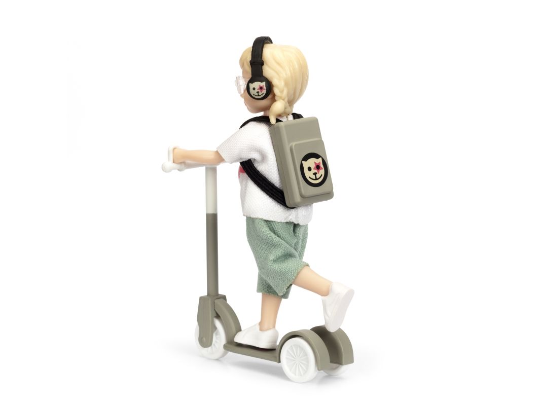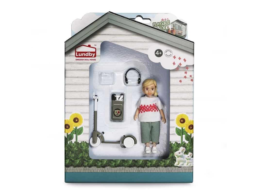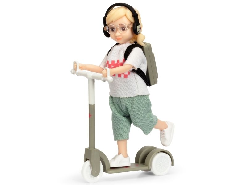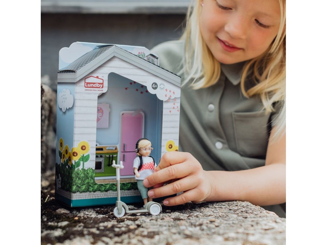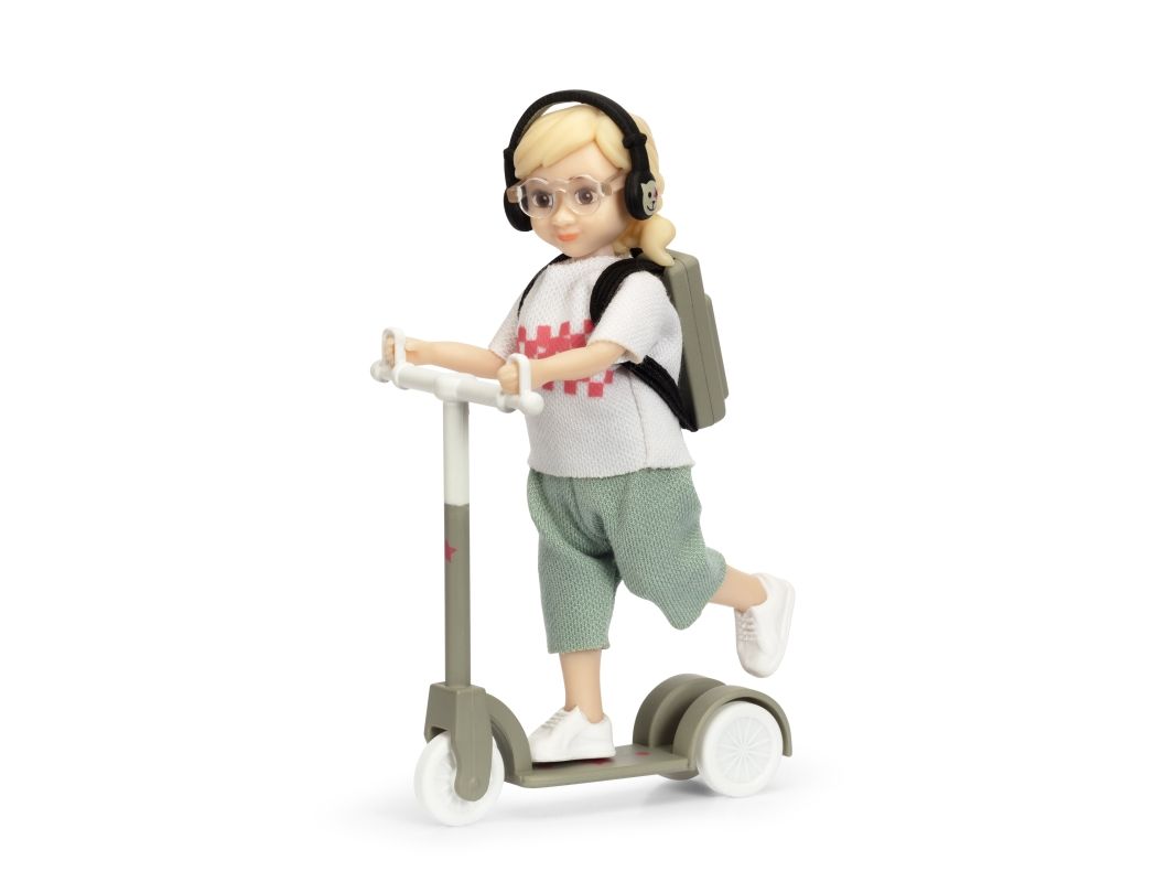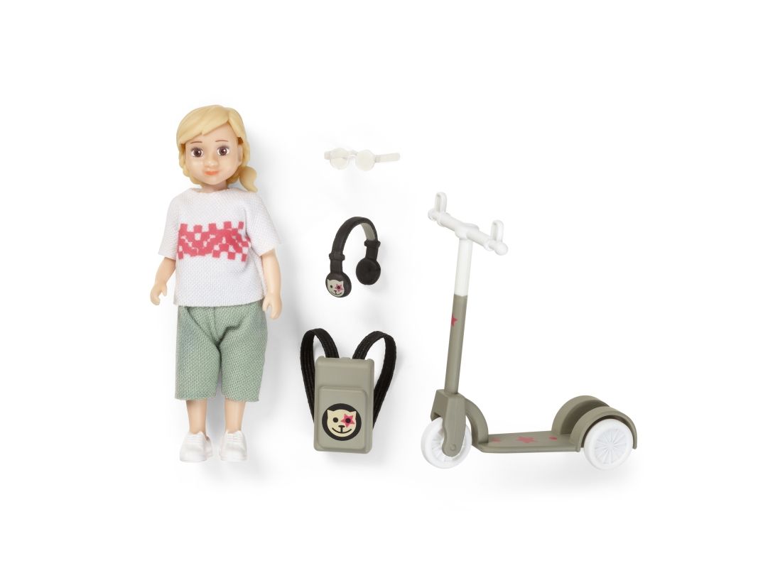 Dockset från Lundby. En fin dockhusdocka med glasögon, hörlurar, ryggsäck och sparkcykel. Sparkcykeln har snurrande hjul och smarta handtag för dockans händer.