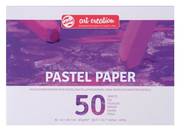 Talens Art Creation pastel paper is specially prepared to make the most out of your pastel drawings. Each pad contains 50 sheets of A3-sized (42 x 29.7 cm or 16.5” x 11.7”), 90 g/m² (48 lbs) paper. The paper is glue bound on one side so it stays perfectly flat while in use and can easily be removed when finished drawing.