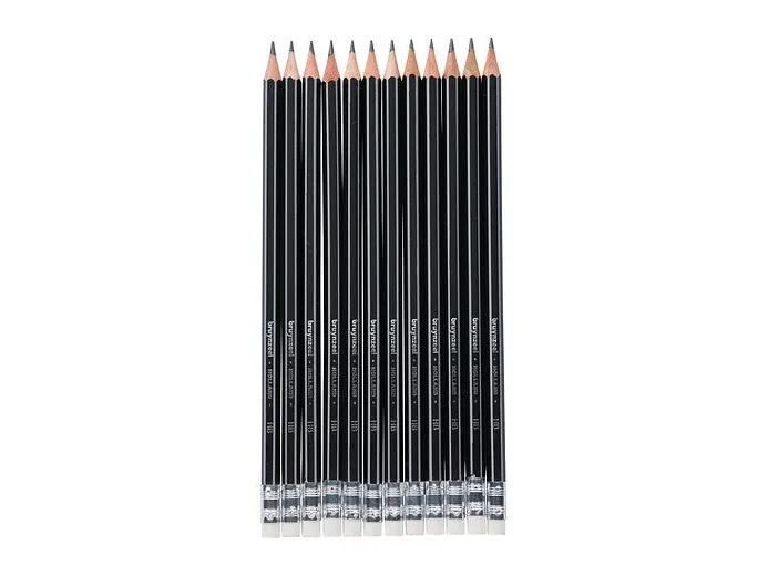 12 HB Graphite pencils of the typical Bruynzeel quality, with an eraser on top. Specially created for schools. Extra strong, thanks to a thick core and the complete adhesion of the core to the wood. <