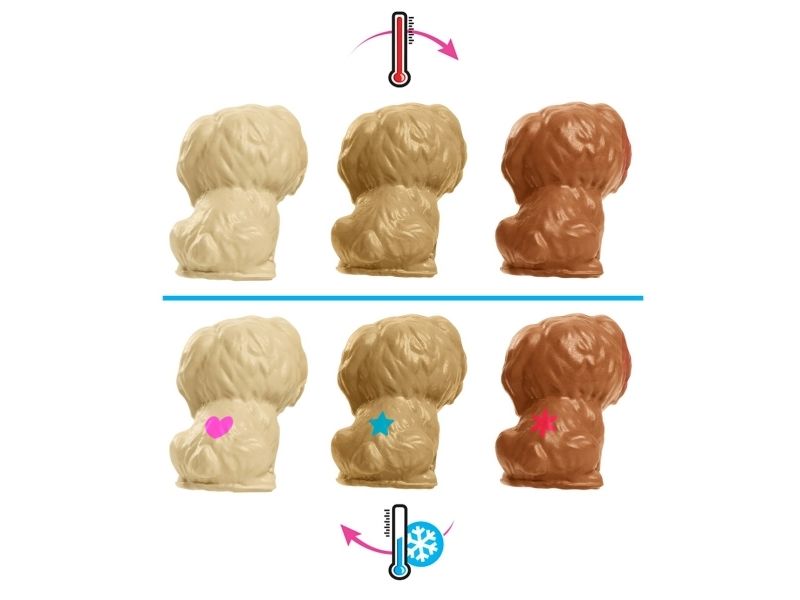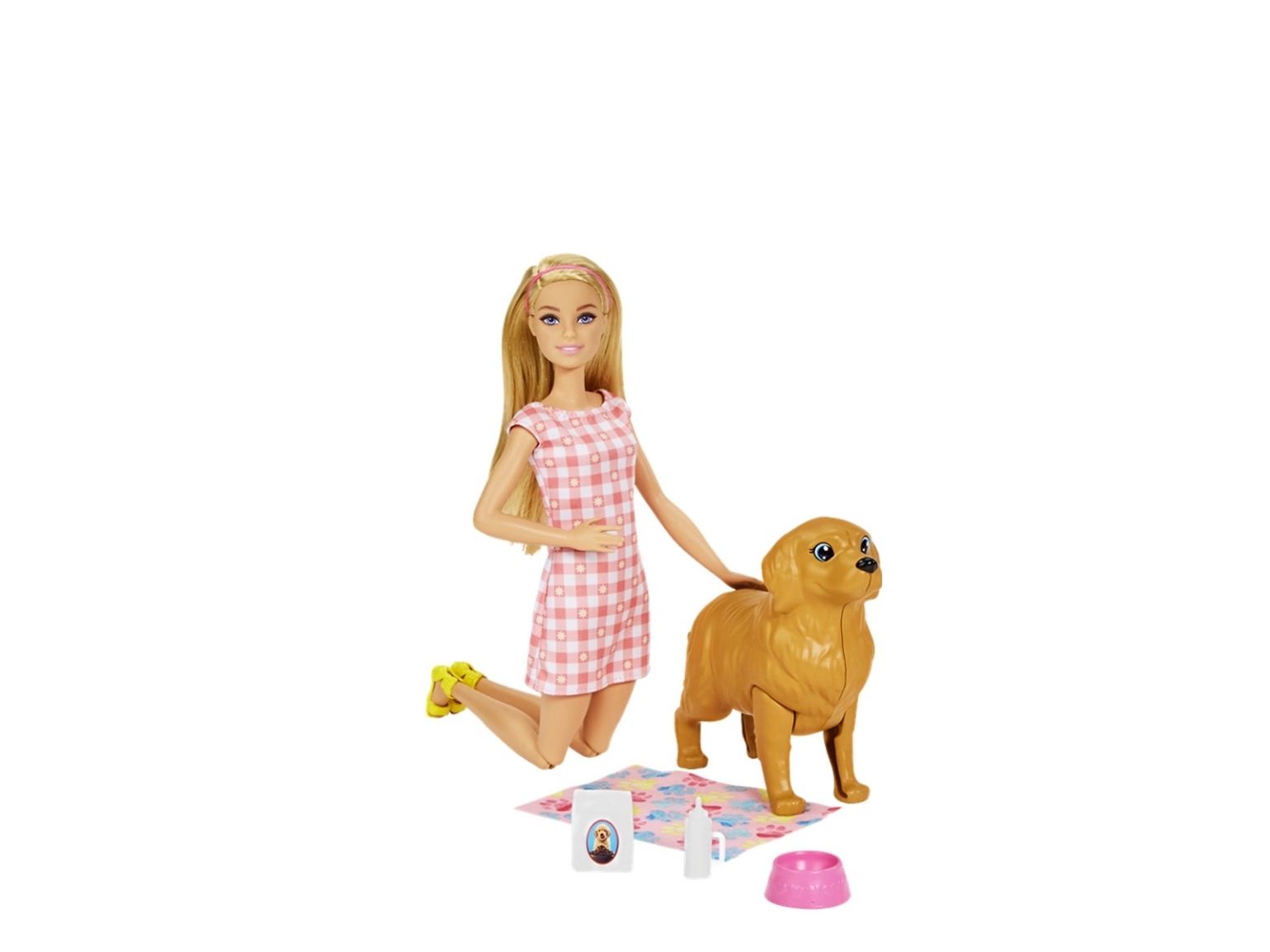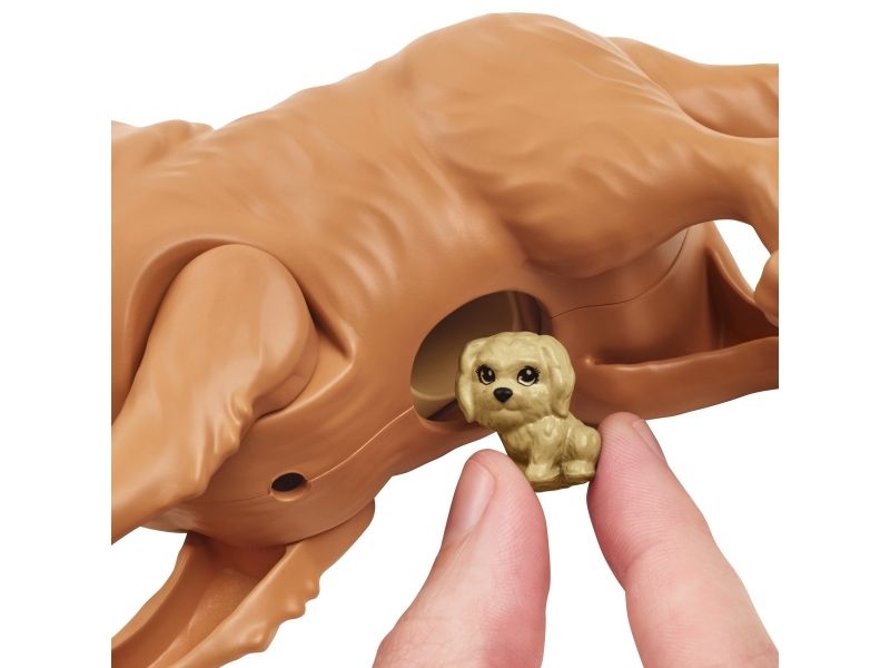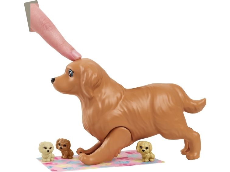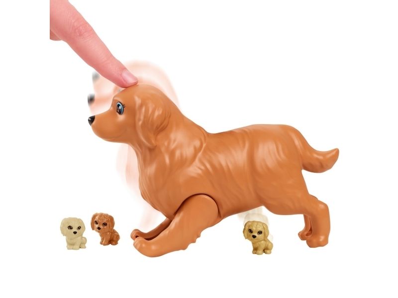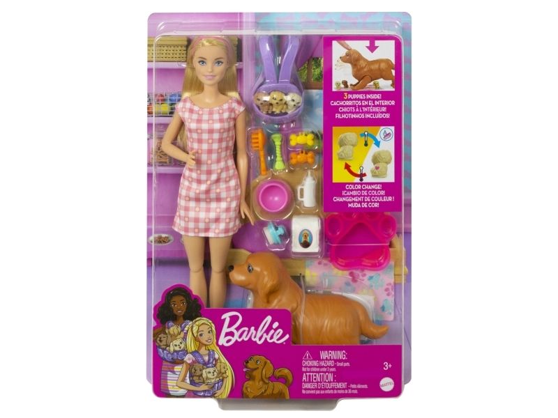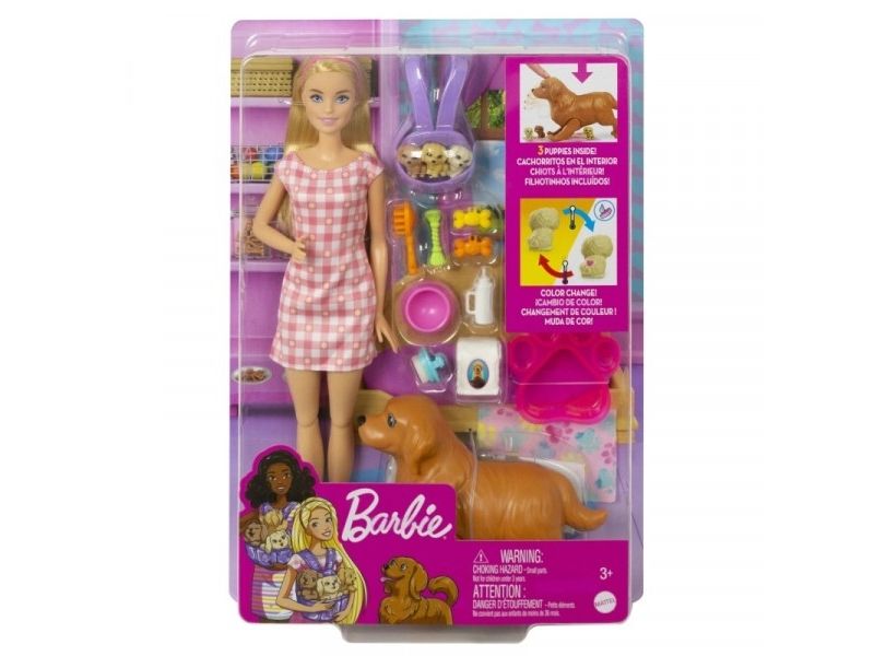 Vilken glad nyhet – Barbie-dockans söta hund ska ha valpar! Med Barbie Newborn Pups-leksetet kan barnen hjälpa Barbie-dockan trycka på hundmammans rygg så att hon föder tre söta hundvalpar. När valparna har fötts kan barnen fylla baljan med iskallt vatten, doppa handduken och torka av valparna så att deras särskilda födelsemärke visas på var och en Barbie-dockans flexibla knän gör det enkelt för henne att ta emot valparna, och hon kan bära med sig alla tre i den gulliga bärselen när de ska gå ut! Bland övriga lektillbehör finns en flaska, två borstar, repleksak, två godsaker, en påse hundmat och en skål. Med så många skötseltillbehör och lekmöjligheter blir Barbie-leksetet med nyfödda valpar en utmärkt present till alla barn från 3 till 7 år, särskilt de som gillar djur! Dockan kan inte stå utan hjälp. Färger och dekorationer kan variera.