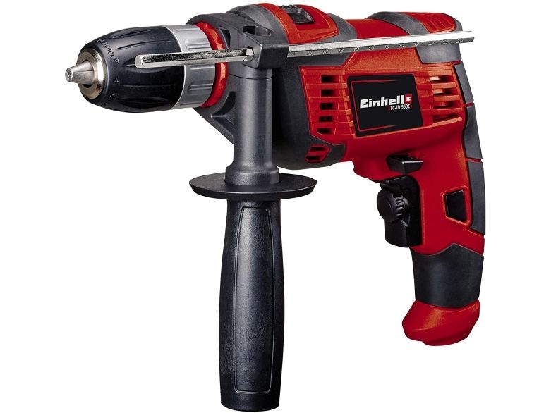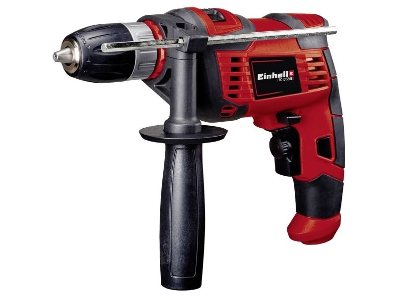 The Einhell TC-ID 550 E impact drill is of compact design and easy to handle, making it the ideal addition to the home tool set. The impact drill is equally suitable for beginners and experienced craftsmen alike and delivers good results for all conventional drilling jobs in and around the house. The TC-ID 550 E can be used for a wide range of applications: In next to no time it gets the job done when it comes to fitting holders in the bathroom or shower cubicle, installing kitchen shelving or securing heavy picture frames. Lamps, projectors or flat screen monitors can be installed effortlessly. The electronic speed control with speed preselector regulates the initial drilling of brittle or soft materials such as tiles or washed concrete to make the job easier. The rugged metal depth stop ensures precise operation even for drilling jobs in rapid succession. With such technical assistance for extreme precision, best results are achieved even on difficult materials. The impact drill also has a reverse function for drilling and screwdriving, and an infinitely adjustable additional handle for optimum operation. The additional handle enables the ambitious hobby DIY enthusiast to hold the impact drill securely with both hands and direct the power exerted to exactly where it is required. The impact drill from Einhell is equipped with a 13 millimeter quick-change chuck for for easy tool change. There is therefore no need for an additional chuck key for the chuck.
