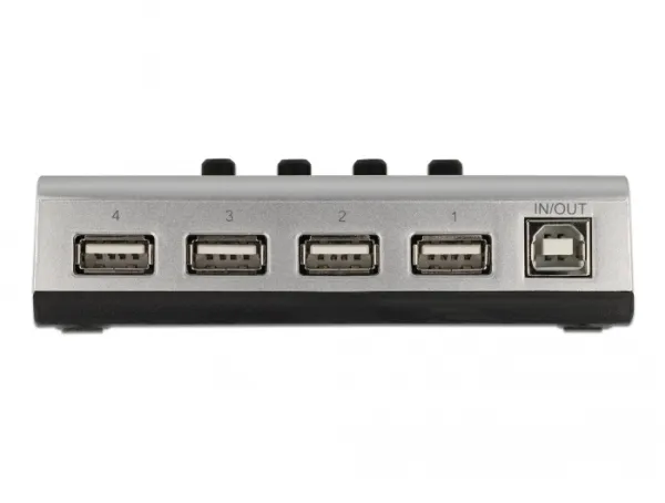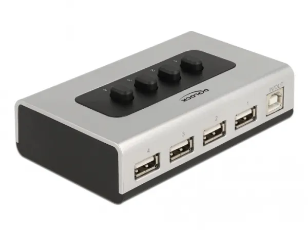 This bidirectional USB 2.0 switch by Delock allows a computer to use four USB peripheral devices. With the four buttons on the switch, the computer can establish a USB connection to the desired peripheral device. Printers, card readers, hard drives etc. can be specifically activated and made available to various applications.