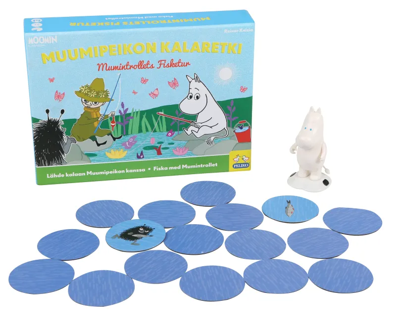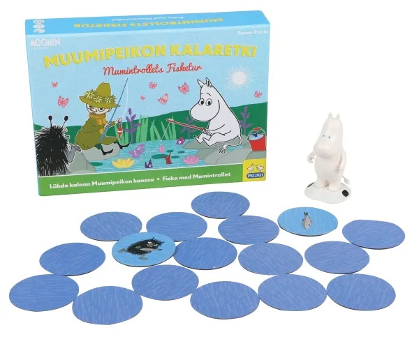 Häng med Mumintrollet på fisketur - den med flest fiskar vinner spelet. Mumin fiskar med hjälp av sitt magnetiska underlag och magnetiska spelbrickor med fiskar - men man måste akta sig för kaffepannor som också lurar i sjön! Spelet är kul och lätt att lära sig. Årets Barnspel 2016 i Finland. Regler på svenska, finska, engelska. 2-4 spelare, 15 min, 3+