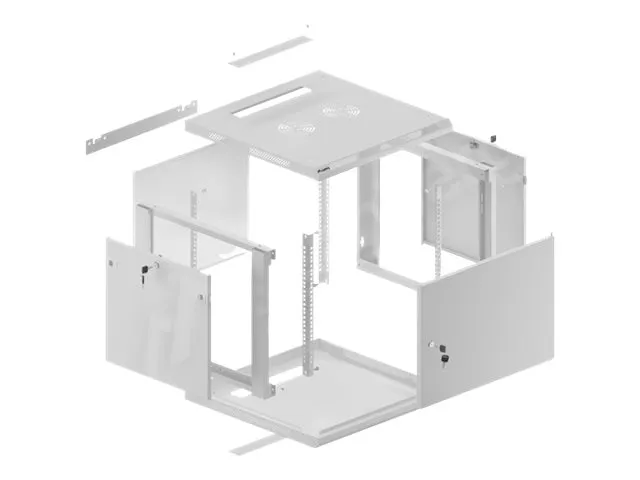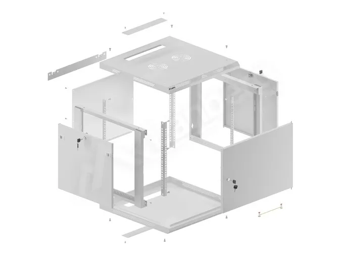Platt paket, låsbar främre dörr, borttagbara sidopaneler, låsbara sidpaneler, 2 platser för fläkt, övre och undre kabelingångspunkter