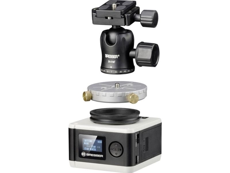 Hvis du allerede har et stabilt foto-stativ med video-vippehoved, kan denne BRESSER StarTracker Astrofoto-montering ved hjælp af 1/4 & 3/8 fotogevindhuller anvendes direkte med. Indstillingen af polhøjden (breddegrad) sker via video-vippehoved. Foto-montering og stativ med polsk og stativtaske fås også som bundle - bes