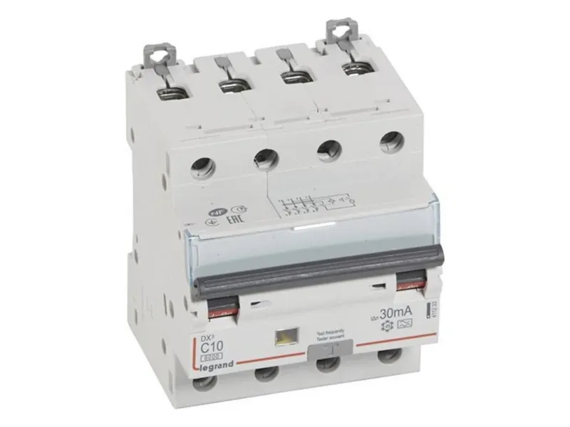 Legrand 411233 DX3 Fi/LS-kontakt C10ALegrand Fi/LS-sikkerhedsafbryder DX3, type A, til veksel- og pulserende jævnfejlstrømme. I henhold til en 61009-1, øjeblikkeligt. LS-beskyttelseskontaktdel: C-karakteristik. Mærkespænding: 230/400 V~, dimensioneringsbrydeevne på 6 kA, stødstrømfast op til 250 A, aktiveringsvisning: Blå=fejlstrøm eller betjening med taster, farveløs= kortslutning eller manuel udløsning. Fastgørelse på din-profilskinne en 60715 med hvilende lynmonteringer, klar information foran på hvert apparat, entydig indstillingsvisning rød/grøn på kontaktstangen (kan låses), med mærkningsvindue, med undermonteringsbeskyttelse til sikker indføring af lederen i kørestol, montering af hjælpeapparater.