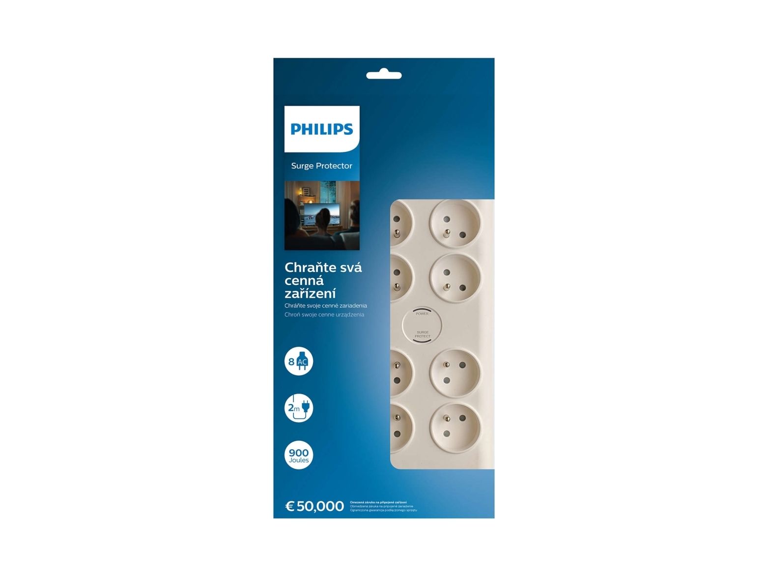 Philips SPN7080WA/60, 900 J, 8 AC-utgångar, 3680 W, 16 A, Vit, 2 m