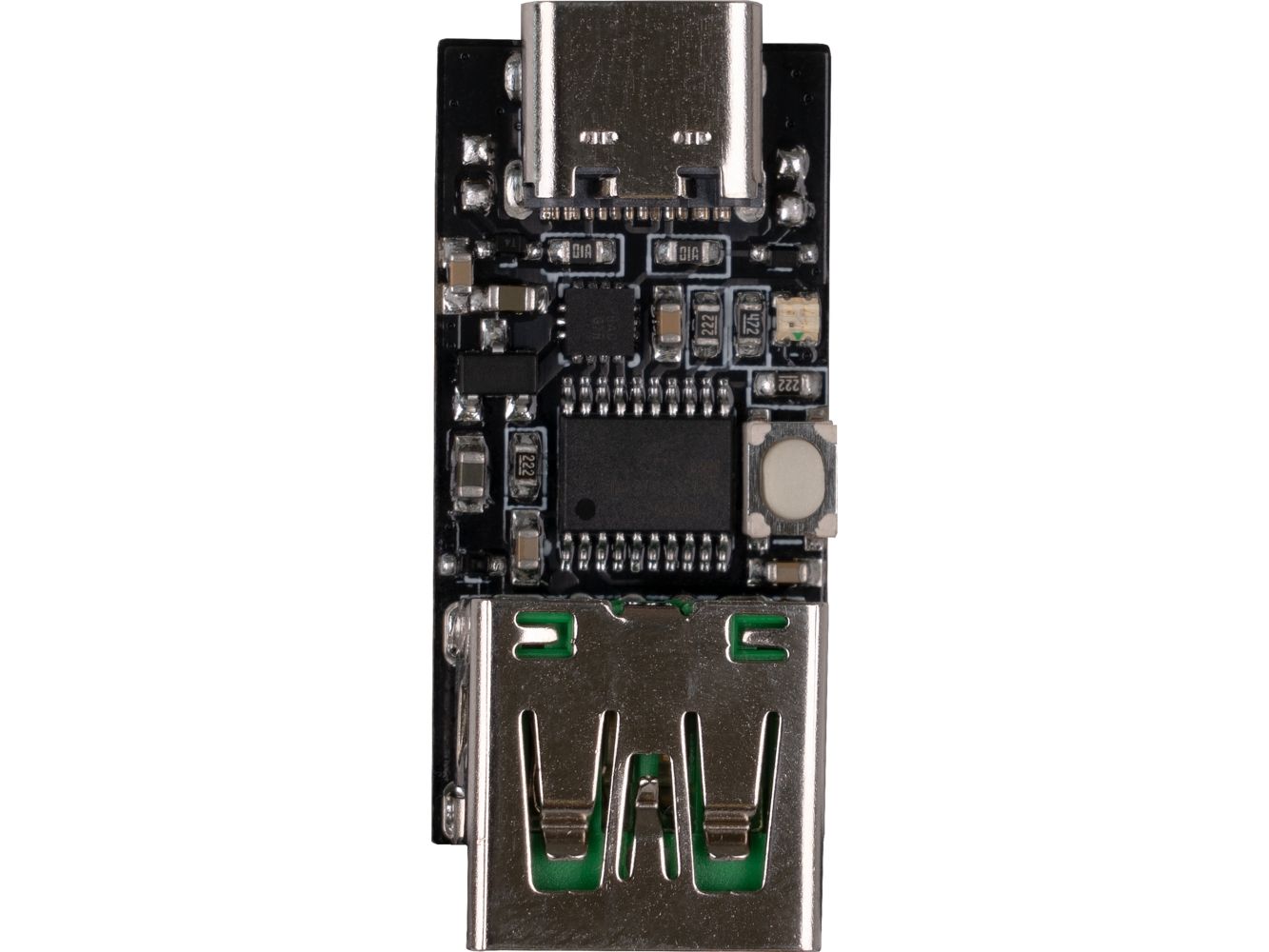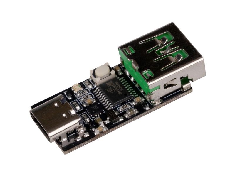 With this small module, you can trigger USB-PD protocols and thus, for example, charge your laptop via a PD-capable USB-C power supply. The output voltage can be adjusted in 5 steps (5 V, 9 V, 12 V, 15 V and 20 V) via the button integrated on the module. The currently selected voltage can be read from the colour of the RGB LED integrated on the module. The module can be used flexibly and is highly integrable.