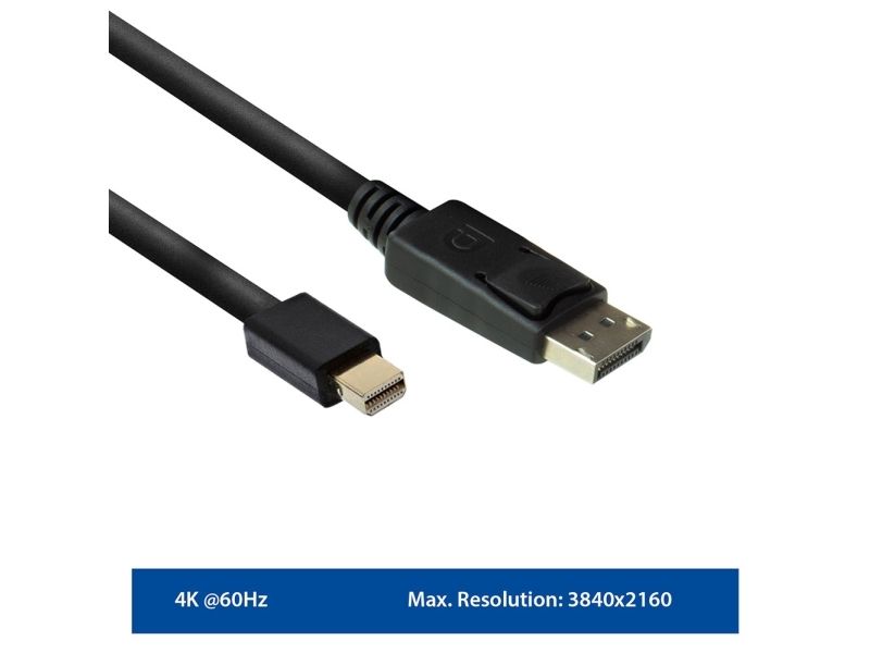 The EW9865 Mini DisplayPort to DisplayPort Adapter Cable connects your laptop with a Mini DisplayPort output to a monitor or beamer with DisplayPort input. The cable has a length of 2 m. The maximum supported resolution is 3840 x 2160 (4K) @ 60Hz.