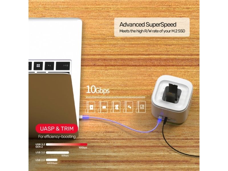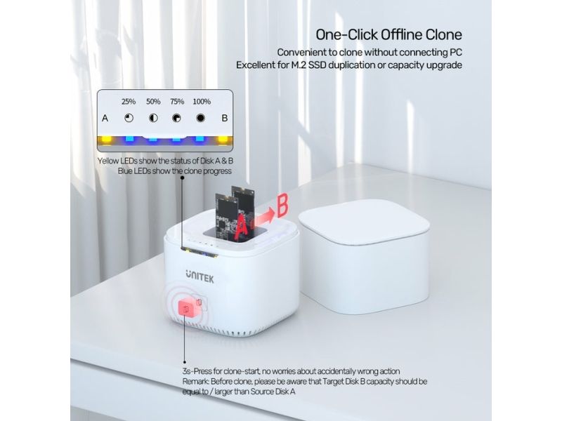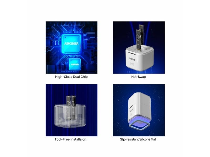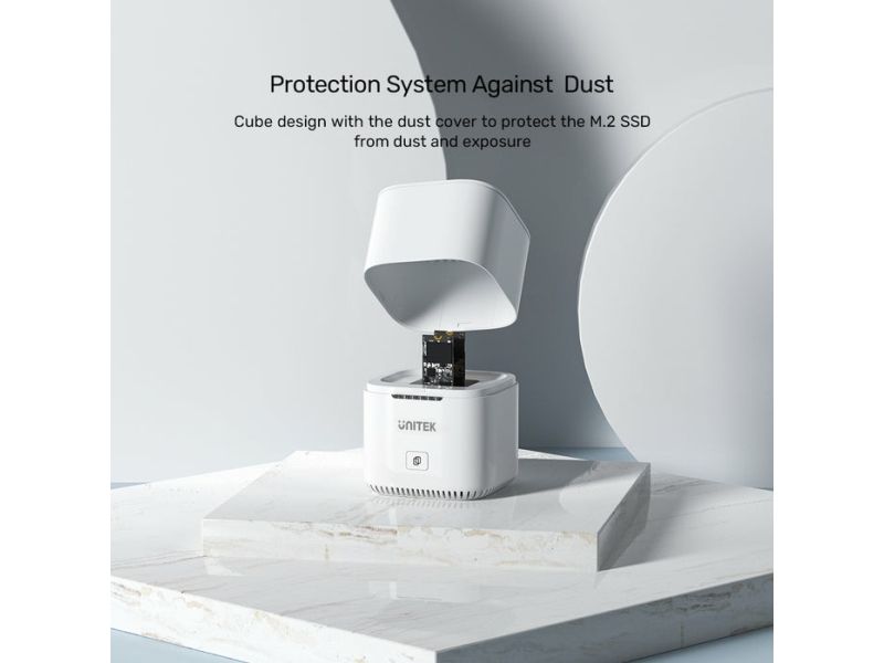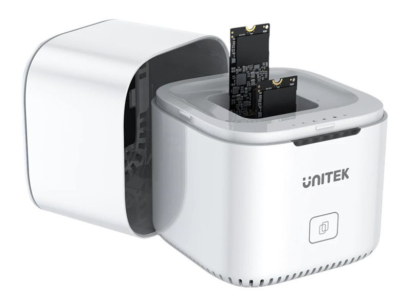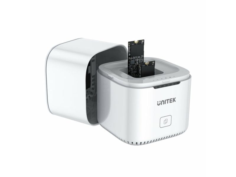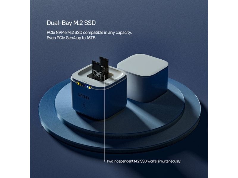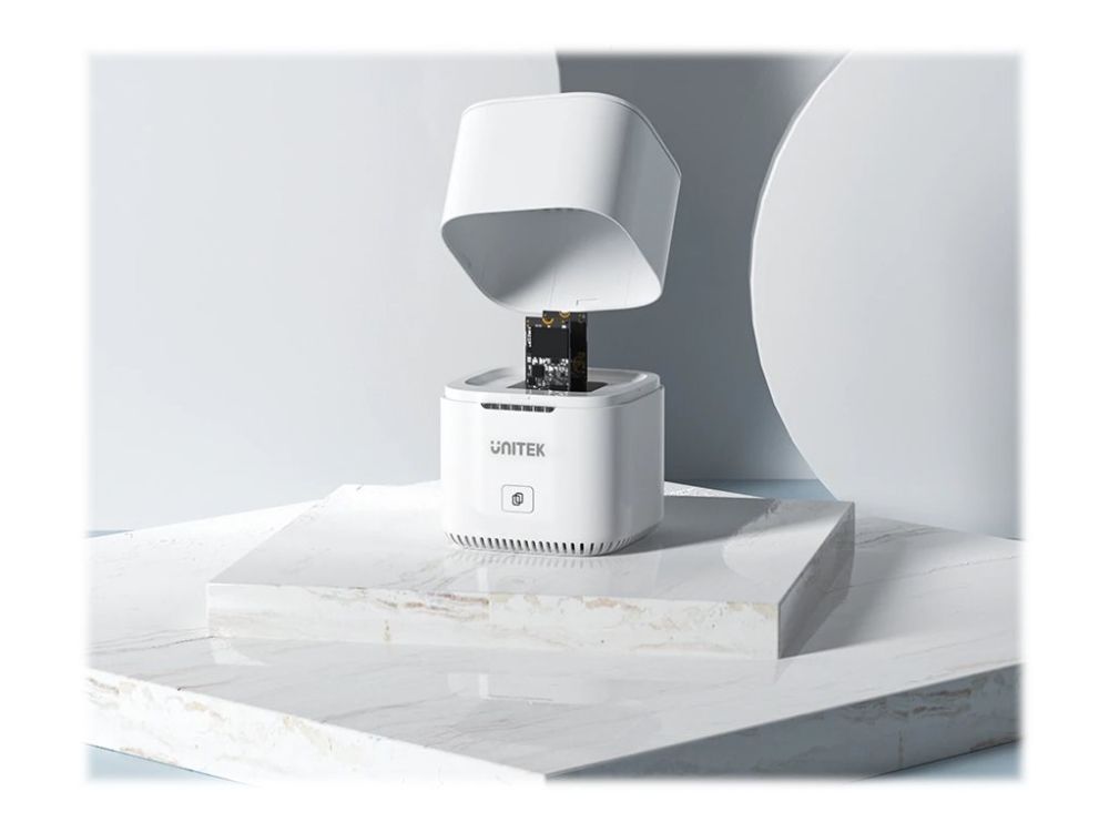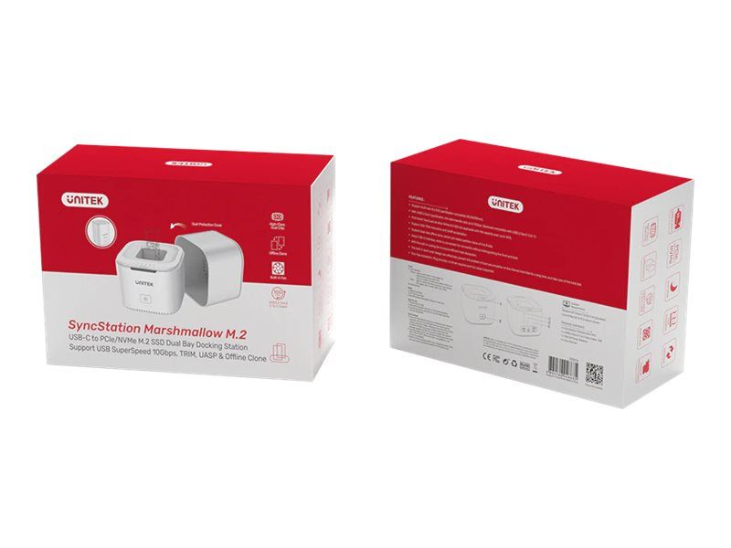 Unitek SyncStation Marshmallow S1207A är en HDD-dockningsstation som är utformad för effektiv dataöverföring och lagringshantering. Med en 1 m lång USB-C-kabel och ett USB 3.2 Gen 2-gränssnitt levererar den dataöverföringshastigheter på upp till 10 Gbit/s. Denna dockningsstation har stöd för två M.2 solid state-enheter, vilket ger omfattande lagringsmöjligheter samtidigt som den externa formfaktorn är kompakt.