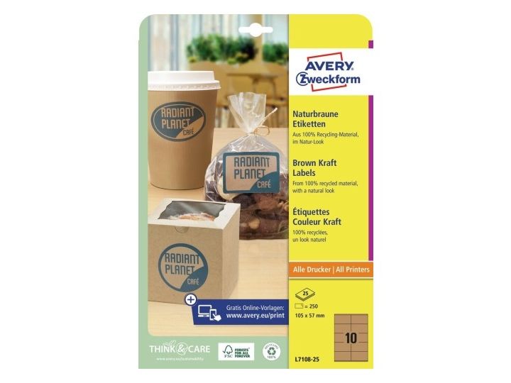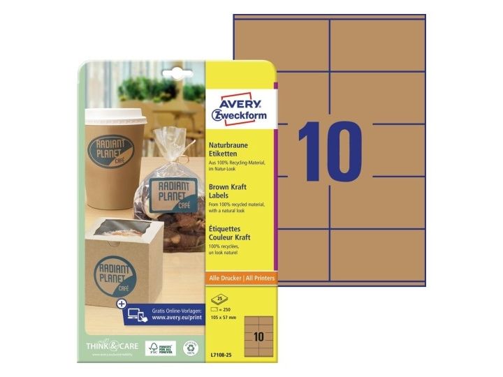 Kan man både være moderne og miljøvenlig? Ja da! Giv dine produkter et moderne naturlook med Avery's L7108-25 naturbrune etiketter med 10 etiketter/ark og 250 etiketter/pakke, de er miljøvenlige og fremstillet af 100% genbrugsmateriale.