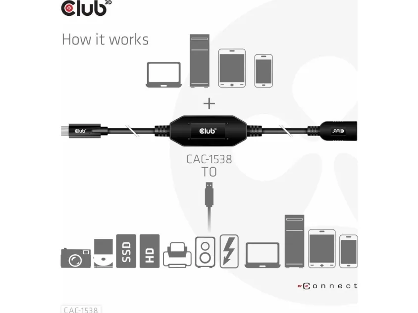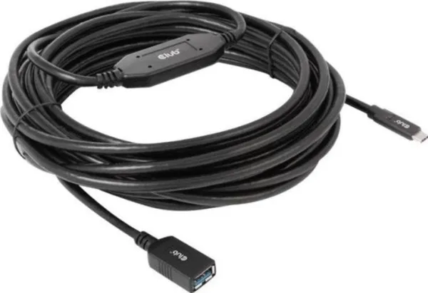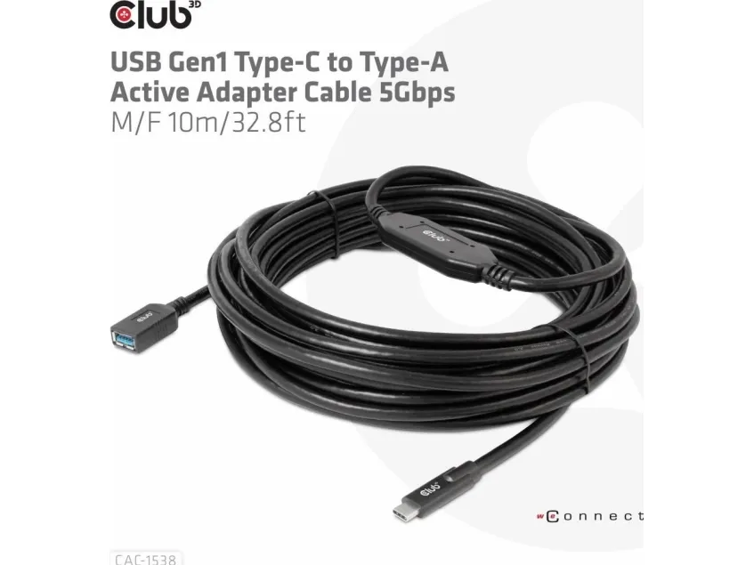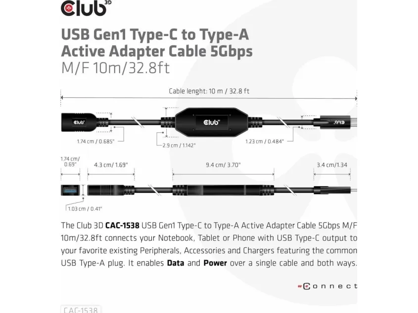 The Club 3D CAC-1538 USB Gen1 Type-C to Type-A Active Adapter Cable 5Gbps M/F 10m / 32.8ft connects your Notebook, Tablet or Phone with USB Type-C output to your favorite existing Peripherals, Accessories and Chargers featuring the common USB Type-A plug. It enables Data and Power over a single cable and both ways. This cable supports USB Gen1. SuperSpeed+ data up to 5Gbps and up to 900mA output for Downstream charging or powering your USB Type-A enabled Notebook, Tablet or Smartphone.
