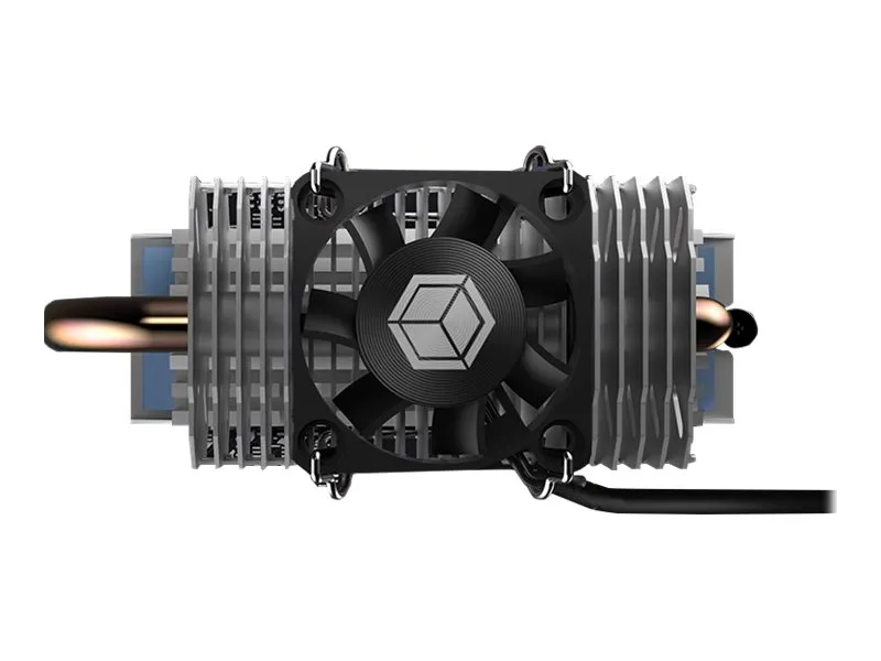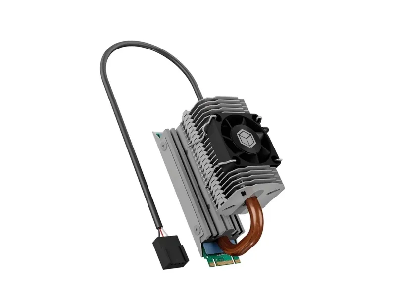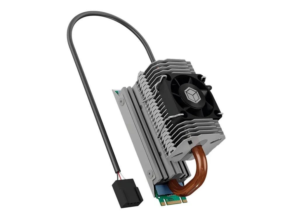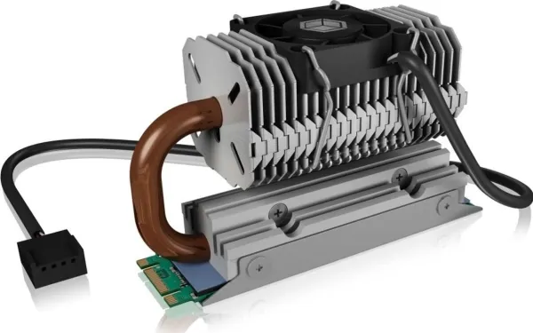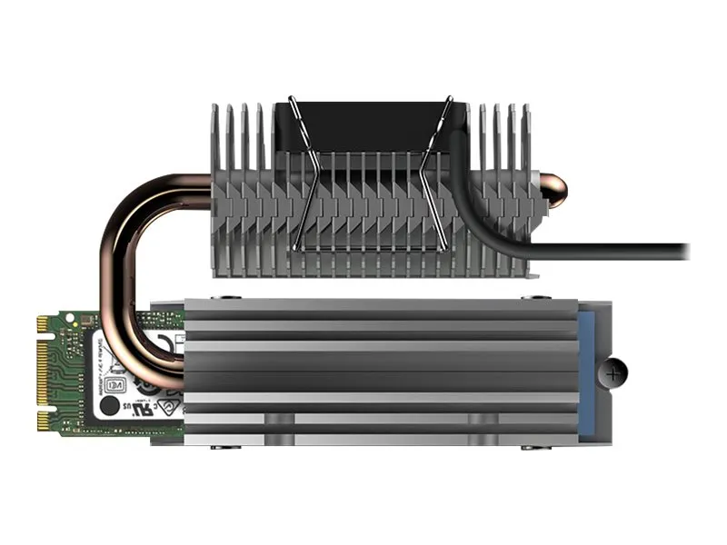 Heat pipe heat sink for M.2 SSD with 30 mm fan and swiveling heatpipe.