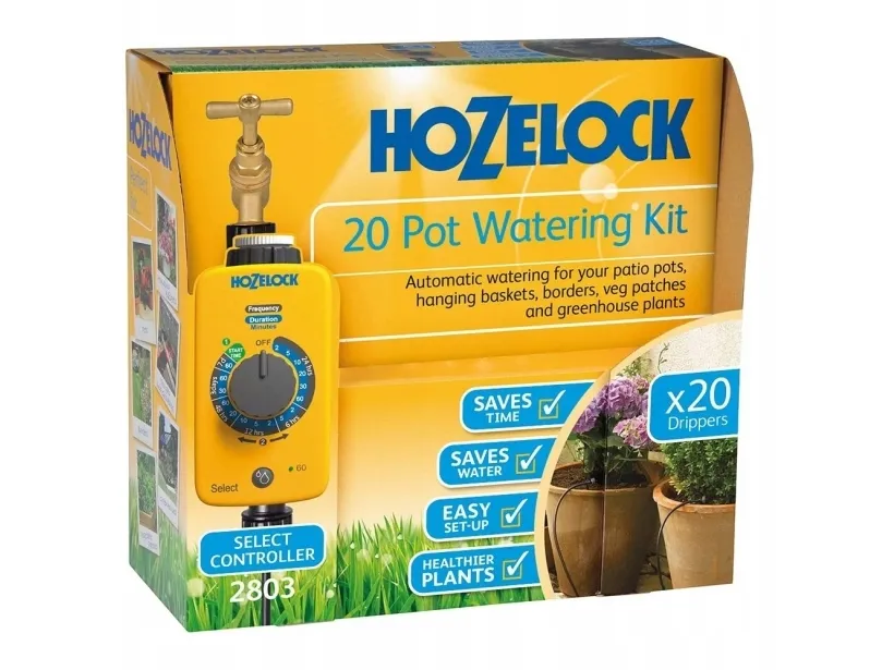 Vandingssæt til 20 blomsterpotterKomplet kabinet med: 1 x Select Controller 1 x trykreduktionsventil 15 m mikroslange (4 mm) 19 x T-stykke (4 mm) 5 x lige tilslutning (4 mm) 5 x vægklemmer (4 mm) 20 x drypper på jordspyd (4 l/h). Automatisk vanding af dine blomsterpotter, drivhusplanter, rabatter og grøntsagsbed. Du kan styre vandingen af dine planter automatisk fra 1 x ugentligt op til 4 x dagligt afhængigt af dine planters behov. Maks. Vandingsvarighed 60 minutter. Du kan på fleksibel vis tilpasse vandingstid, -hyppighed og -starttid. Komplet sæt til 20 blomsterpotter, inkl. mekanisk Select Controller og alle komponenter til oprettelse af et 4 mm vandnetværk med 20 vandingssteder.