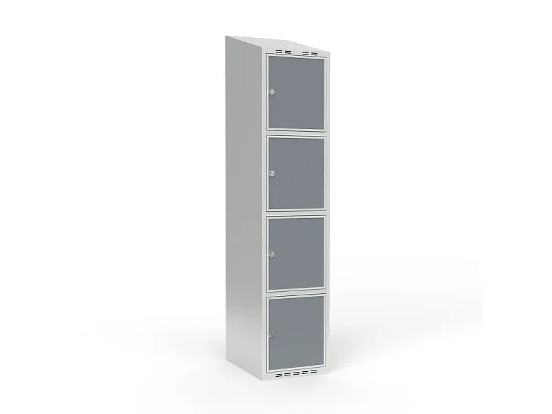 Skolskåp, helsvetsat 1x300 med lutande tak. 4 fack i höjdled. Ljusgrått skåp (RAL 7035) med laminatdörr Lead (F7924). Levereras med förmonterat cylinderlås ASSA 8450 H. Yttermått (b x d x h) 300 x 550 x 1900 mm. FSC-certifierat material.