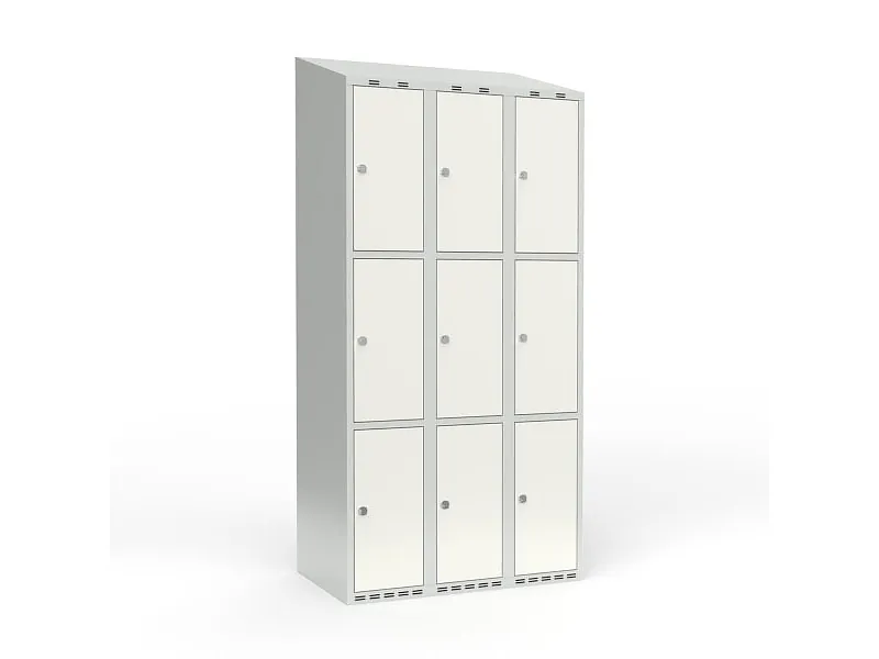 Skolskåp 3x300 Lutande tak 3 fack på höjden Ljusblå ståldörr Cylinderlås