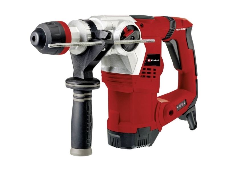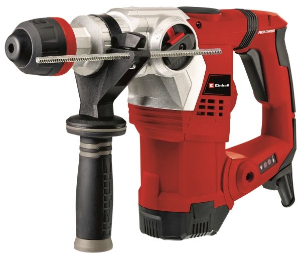 The Einhell rotary hammer TE-RH 32 4F Kit is a powerful 1,250 W helper with four basic functions for restoration and renovation jobs: drilling, impact drilling, chiseling with and without lock. Rotary hammers are used whenever the going gets tough. They hammer and drill into tough material such as stone and concrete. The impact pulses literally "break down” the material, while the cutter eats into the material with its rotating movement and breaks it out. Rotary hammers are suitable for both demolition work and for pulling down or breaking off hard materials such as concrete, brick or stone. rotary hammer delivers up to 5 joules to the tool and with its pneumatic impact mechanism it provides very good forward traction for a drilling capacity of up to 32 mm in concrete. For enhanced resistance and a prolonged product service life the rotary hammer has a robust aluminium gear head, and the status is shown by the status LEDs: Ready for operation or the need for a service due to worn brushes. The press control provides visualization of the optimum contact pressure. Large soft grip surfaces and an additional handle with ribs for secure fastening provide a secure hold and therefore safe handling. The vibration-cushioned main handle minimizes vibrations during use. In addition, the overload safety stop provides enhanced user safety. The rotary hammer is equipped with a robust universal SDS-plus tool chuck with semi-automatic function. For all its power, the speed electronics ensures that the tool can be adjusted to each particular material and application. The infinitely adjustable drilling depth stop is made of solid metal. The product is supplied complete with three drills (Ø 8, 10, 12 mm) and a pointed and flat chisel in the transport and storage case E-Box.