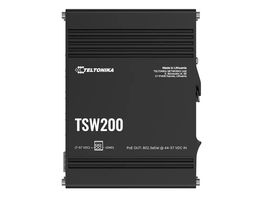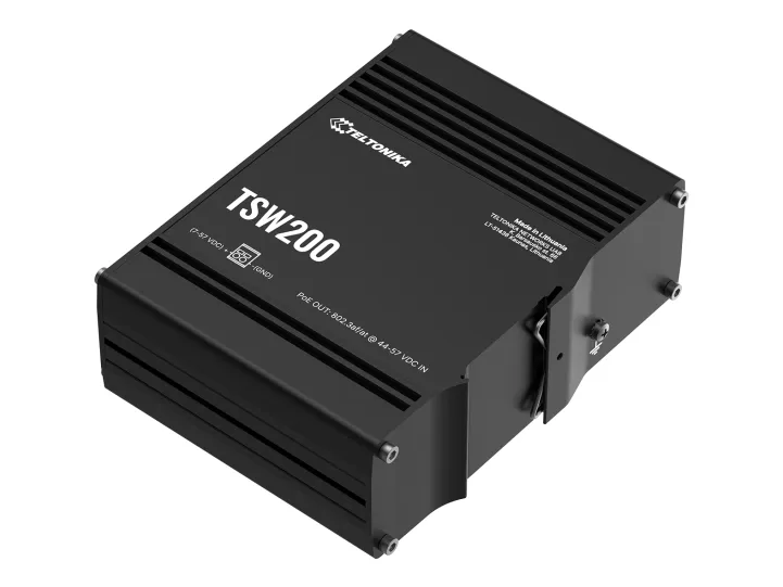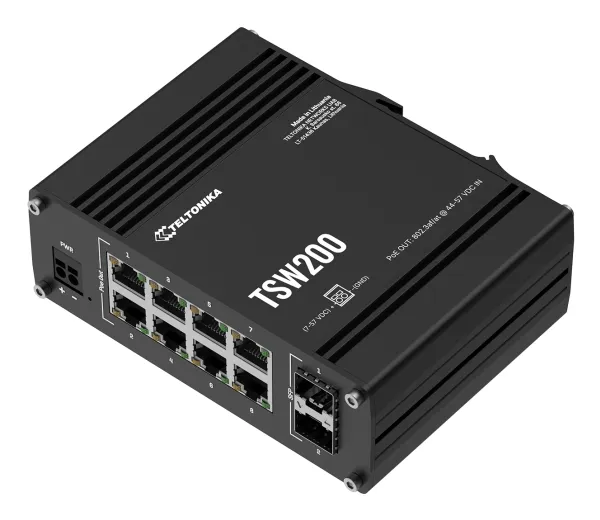TSW200 är en obemannad industriswitch med 2 SFP-portar för fiberoptisk kommunikation med lång räckvidd och 8 Gigabit Ethernet-portar som stöder IEEE802.af och IEE802.3at Power-over-Ethernet-standarder. Den är klassificerad som PSE (Power Source Equipment) och möjliggör centralisering av strömförsörjningen, vilket ger upp till 30 watt per port och minskar behovet av att installera ström.