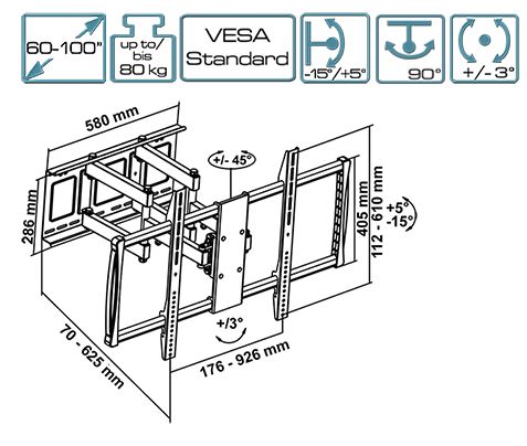 Full Motion-fäste för skärmar upp till 100" / 80 kg - upp till VESA 900 x 600