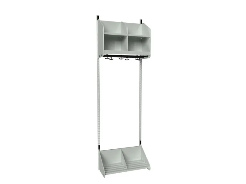 BST kombination A. Garderobstilläggssektion med 2 utrymmen. Garderob och skohylla med skiljeväggar i pulverlackerad vit metall, RAL 9010. 1 väggskena och garderobskena med 6 förankringskrokar. Utrymmesbredd 250 mm och total bredd 515 mm.