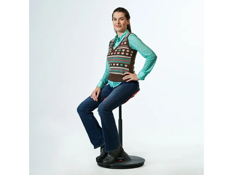 BackApp Hipp bygger på samma unika teknik som föregångaren BackApp Smart. Den ergonomiska sitsen är mjuk, flexibel och har ett material som andas. BackApp Hipp är tillverkad av återvinningsbara material och kan lätt demonteras. På BackApp Hipp sitter du med fötterna på ett underrede som har ett dämpande gummimaterial (TPE) på undersidan. Detta underrede, liksom de rörelser som uppstår när du balanserar på den centrala kulan, ger en behaglig och bekväm upplevelse förutom att stärka de inre coremusklerna. Rörelser för att hitta balansen kommer helt naturligt när du sitter på BackApp. Den här stolen har ett rött säte och svart underrede.