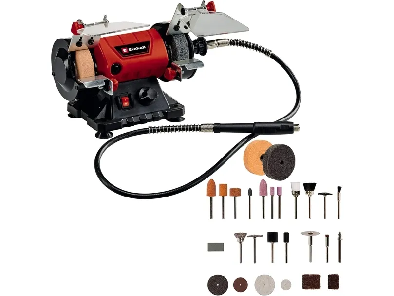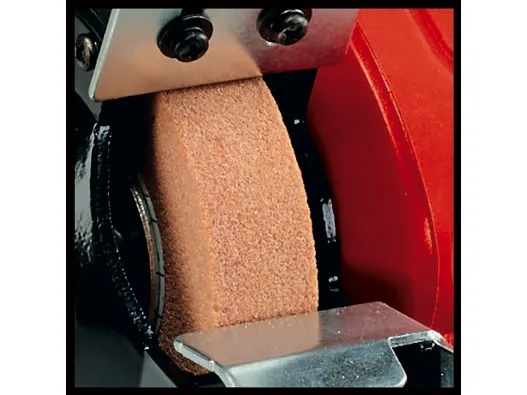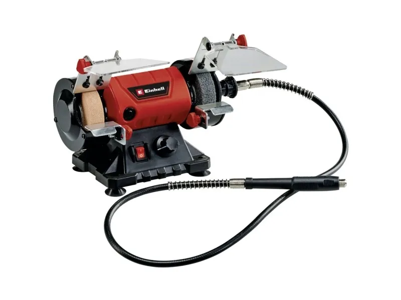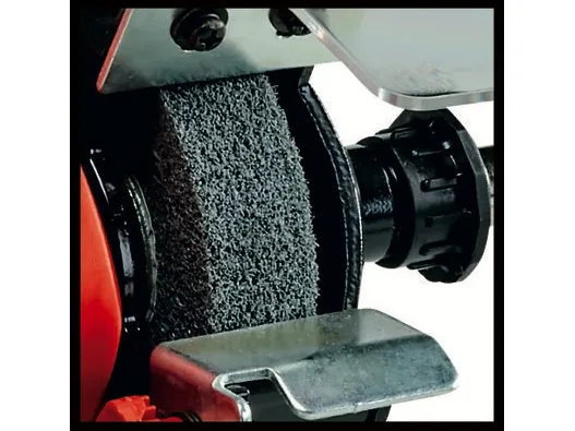 The Einhell TC-XG 75 Kit double wheel grinder is a flexible machine for a wide range of tools: for drill bits and cutters, cutting blades and chisels, and for scissors, knives and blades. The flexible shaft allows for precision working. In addition, the rotational speed can be adjusted to suit the application. Thanks to the extensive accessories included in the Einhell Kit, the double wheel grinder can also be used for performing cutting work, cleaning work and polishing and sanding/grinding work easily and safely. Four rubber feet provide reliable, low-vibration stability. The adjustable work supports make the double wheel grinder easy to work with for the different applications. The adjustable spark guard windows can be adjusted without the need for any tools. Long service life thanks to robust compact metal construction. The double wheel grinder has a ball bearing mounted shaft for precise operation without motion. In addition, the guard hood is closed at the sides for safe operation.